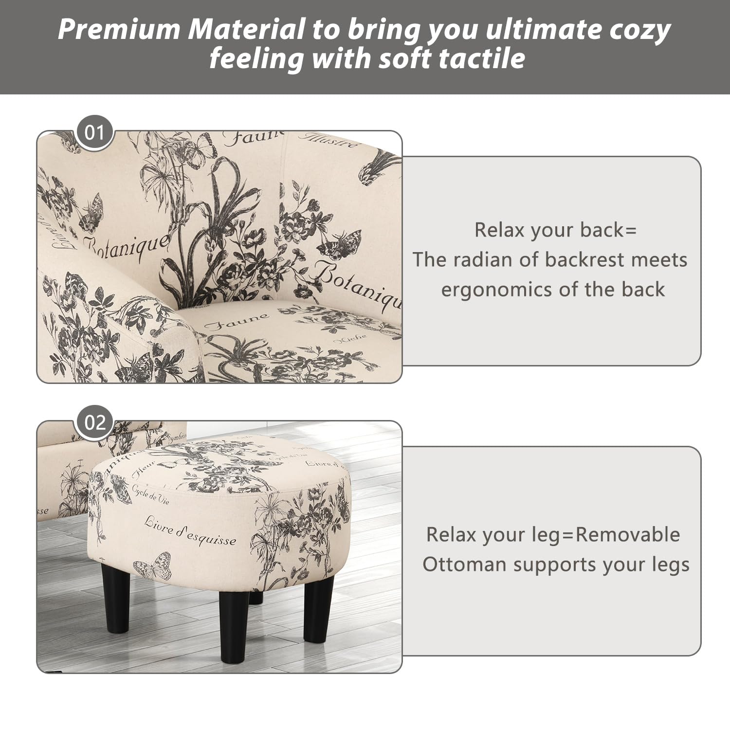 INZOY Modern Accent Chair with Ottoman for Small Space, Club Chair with Ottoman Set, Comfy Fabric Barrel Reading Chairs for Living Room Bedroom, Round Reading Chair with Foot Rest, Flower Pattern