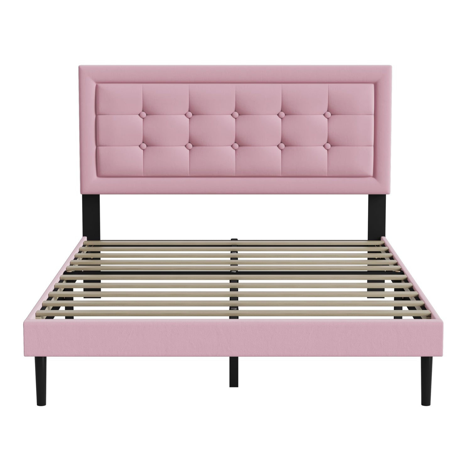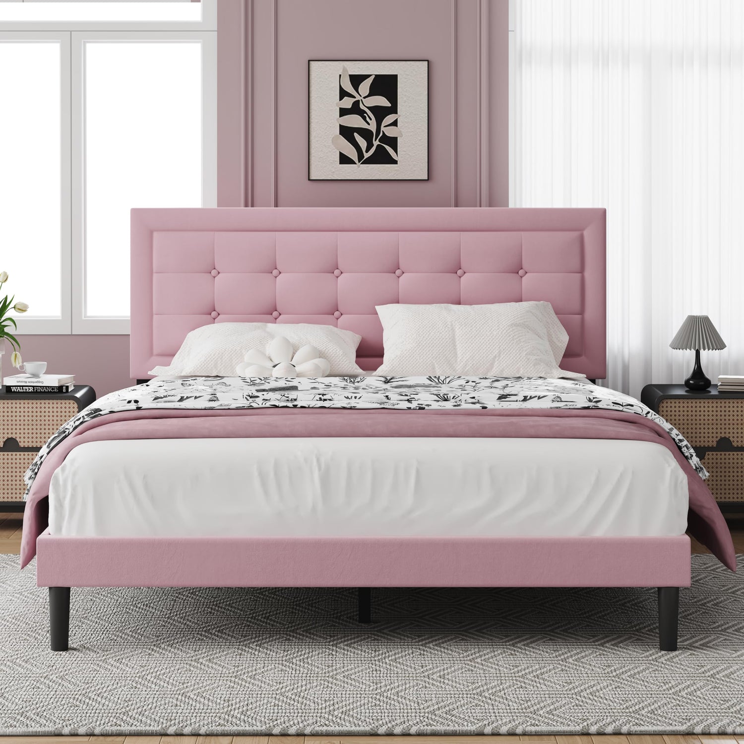 IOILORI Queen Size Upholstered Platform Bed, Queen Size Bed Frame with Tufted Button Headboard, Sturdy Frame Wooden Slats, No Spring Mattress Required, Noiseless, Easy to Assemble, Pink