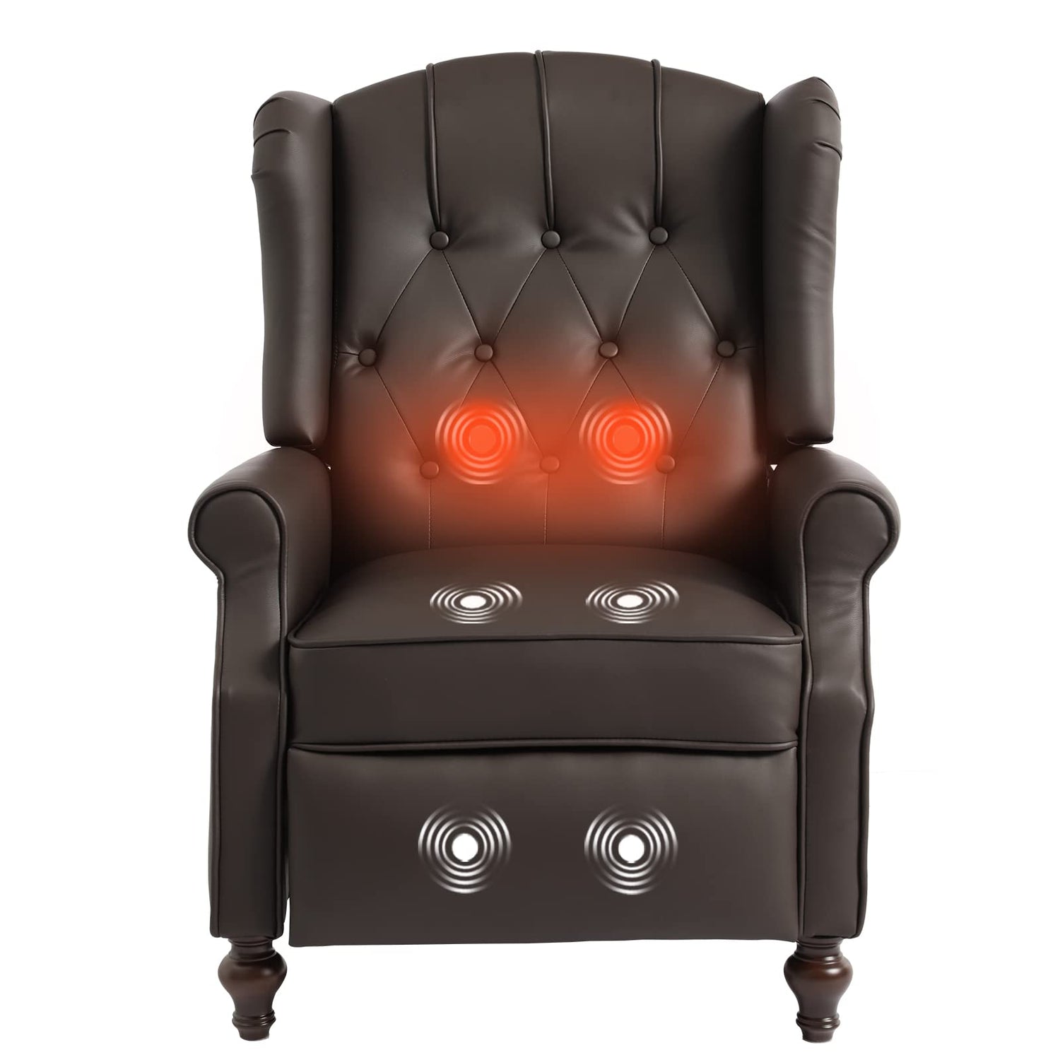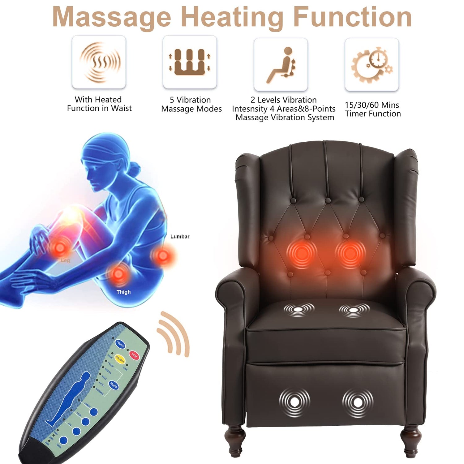 IPKIG Wingback Pushback Recliner Chair - Mid Century Recliner Armchair with Massage and Heat, Rivet Decoration, Button-Tufted Back, Solid Wood Legs for Living Room, Bedroom, Office(Brown)