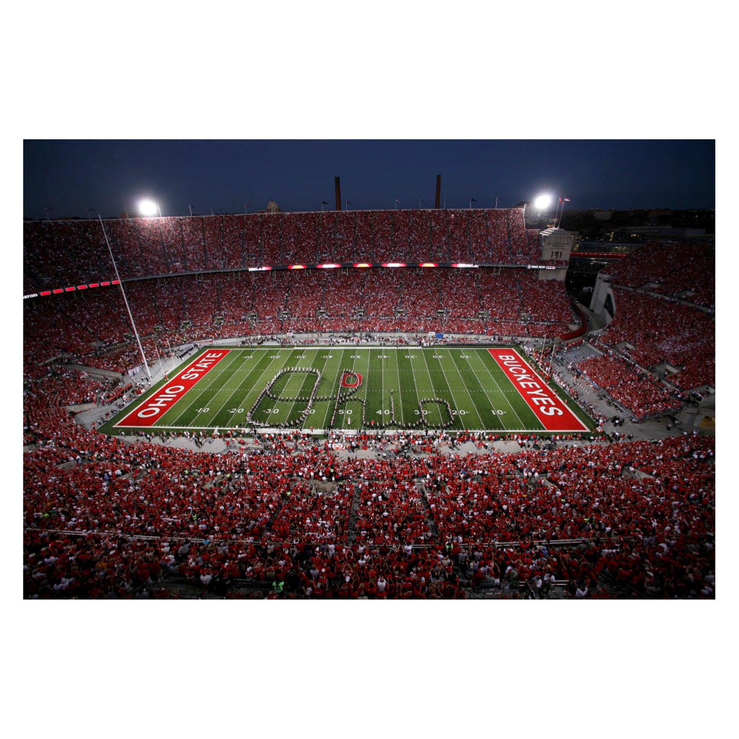 Details: On game days, thousands of fans gather outside of Pioneer Stadium (Ohio Stadium), many wearing red and gray jerseys with team logos and colors painted on their faces, creating a sea of vibrant colors.The atmosphere was electric as fans cheered and sang loudly off the field. Everyone will come together to repeat the school song, and chants ring throughout the campus, creating an atmosphere of unity and excitement.Upon entering the stadium, the stands are filled to capacity with excited fans waving their arms and holding up signs and banners in anticipation of the team's performance. The atmosphere is tense and exciting as fans chant in unison whenever their team is on offense.When the Buckeyes score, the stadium erupts in thunderous cheers as fans hug and jump around to celebrate the team's success. Fireworks and celebrations often accompany the scoring moment.