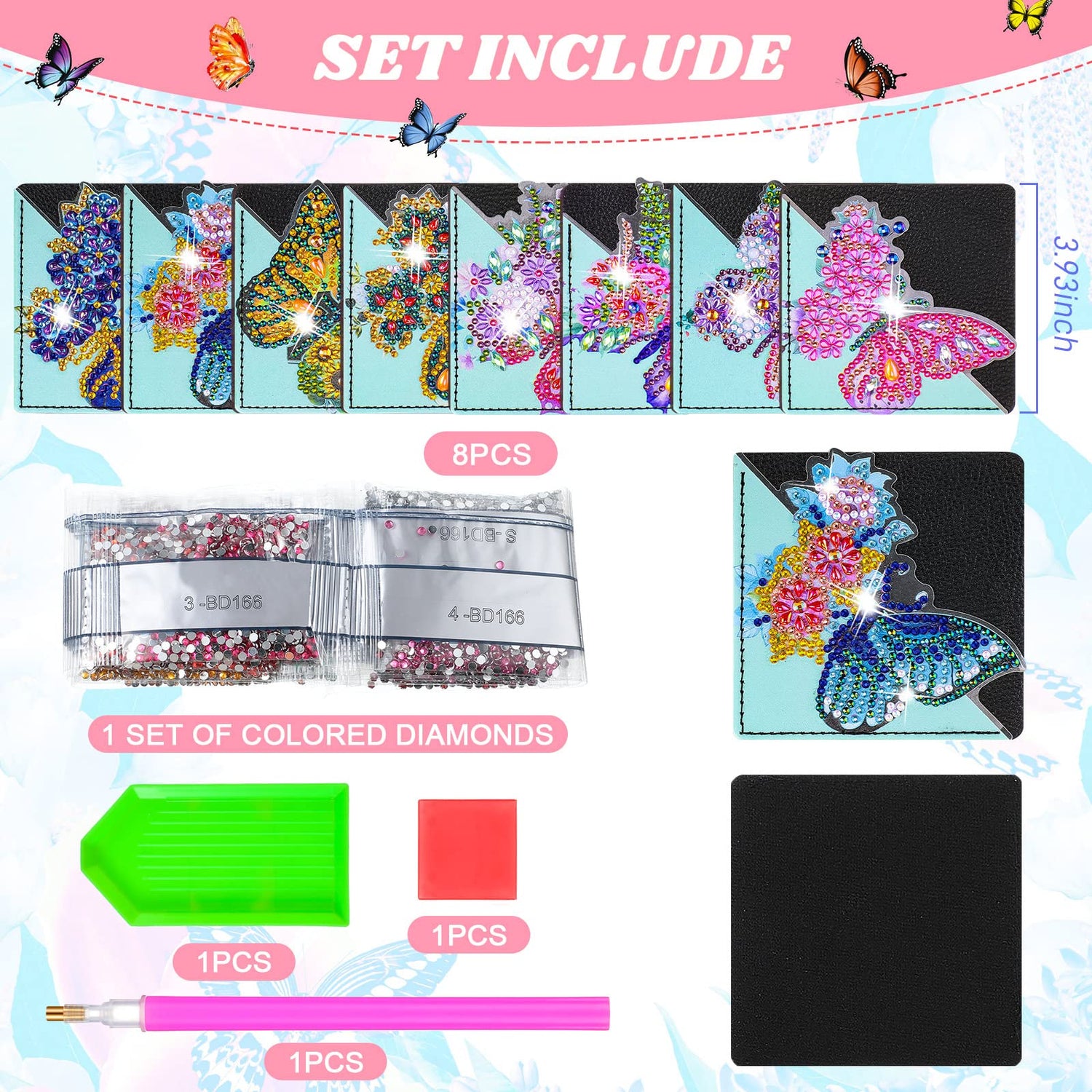 - What Can You Get: you will receive 8 pieces of 8 different butterfly styles of diamond painting bookmarks and 1 set of tools and accessories, including 1 diamond drill pen, 1 jelly glue, 1 diamond plate and 1 pack of mixed diamonds; This DIY kit can meet your needs for various decorations