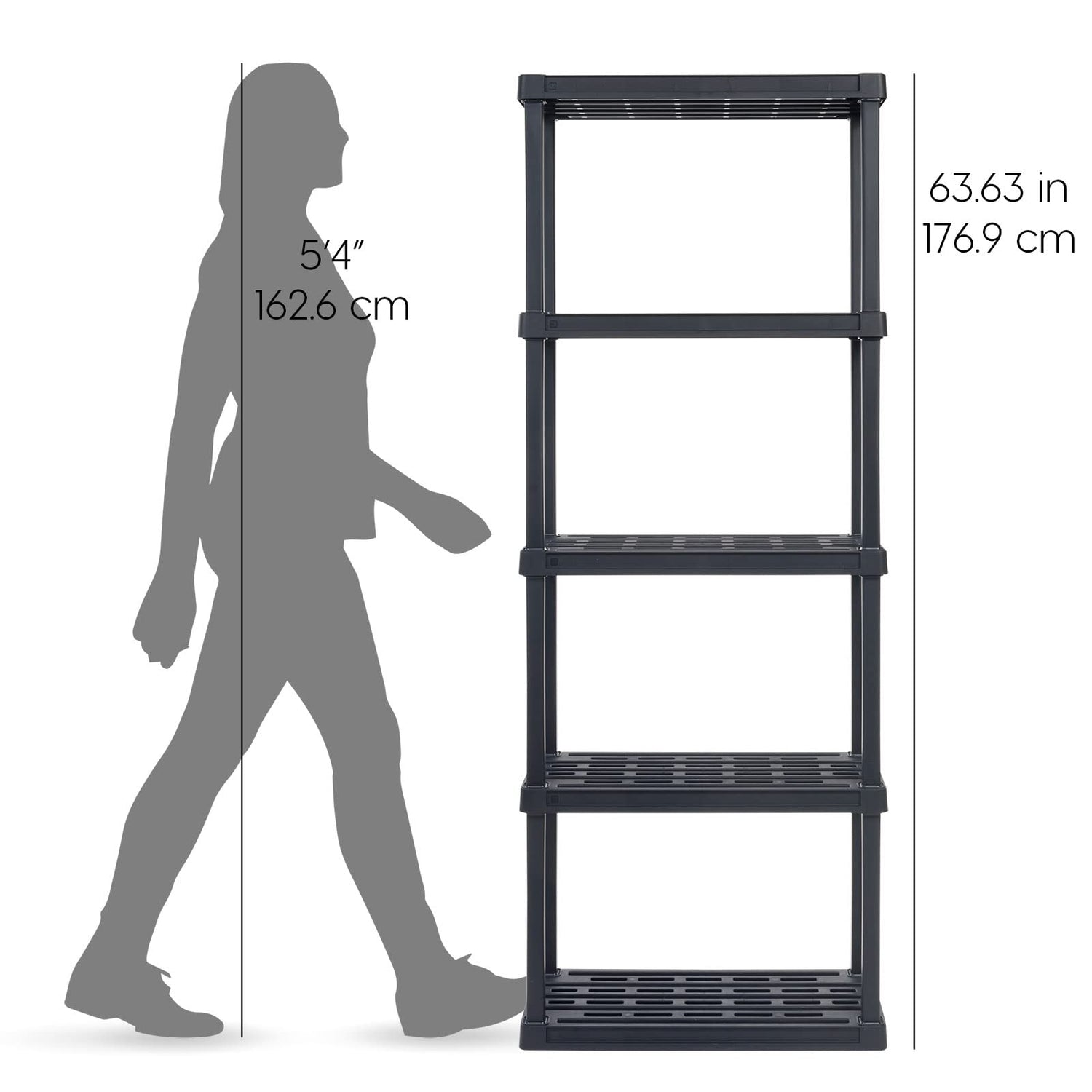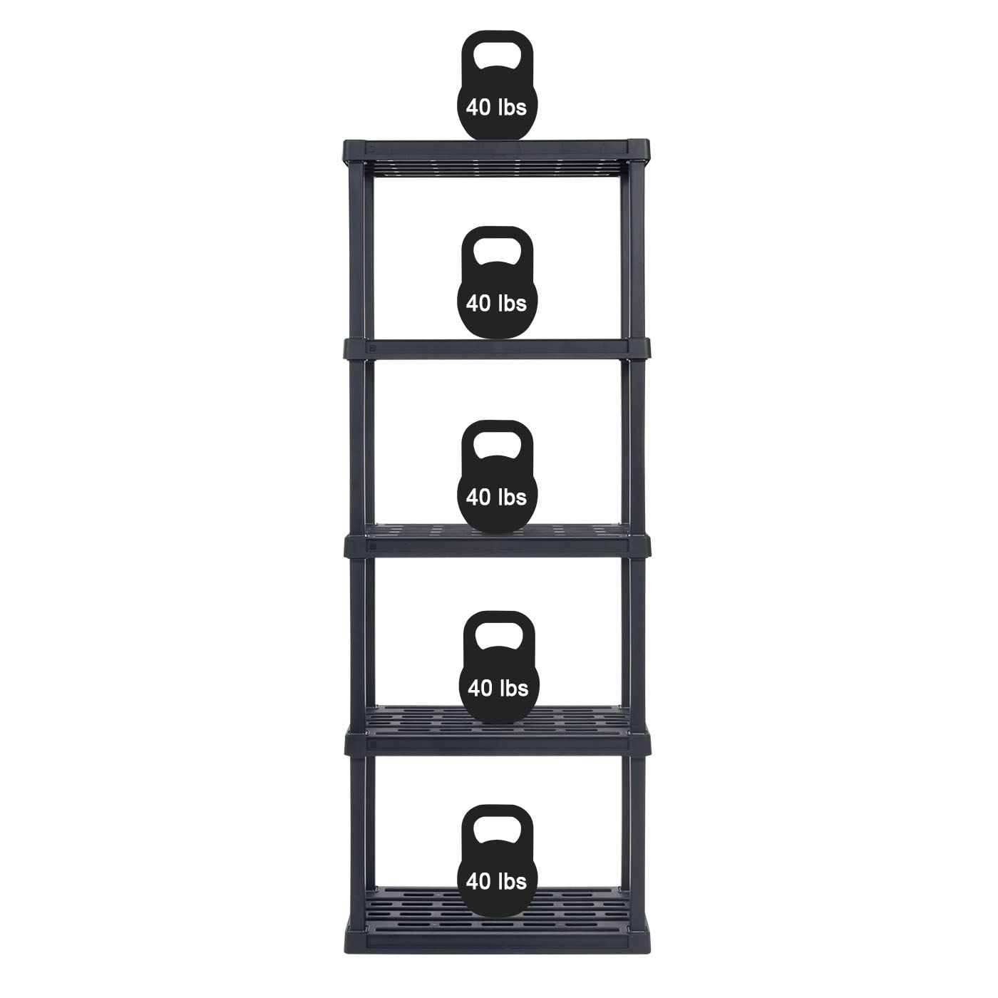 Details: Tackle tougher messes and get organized with the IRIS USA 5-tier recycled plastic storage shelf! The fixed height shelving unit gives you a space-saving and convenient way to keep your stuff organized and within reach while the smooth matte black color easily blends in with the décor of any room in the house or garage. Use the shelving unit in the garage, pantry, basement, closet, entryway, shed, patio, utility or laundry rooms, or anywhere else where a simple yet sturdy shelf is needed. Each shelf on the solidly built and well-ventilated unit holds up to 40lbs per shelf, or 200lbs in total if the weight is evenly distributed between the shelves, and no tools are needed for this easy to assemble unit. Just avoid storing it in direct sunlight. Let's make life a little more organized and a little easier.