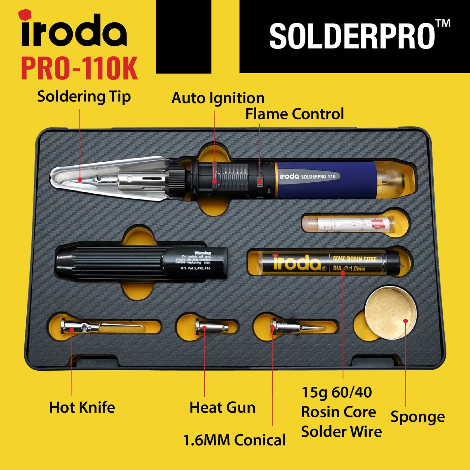 - Versatile Soldering Torch: Experience precision with our soldering torch function, part of the IRODA SOLDERPRO 110K butane soldering iron kit. Ideal for detailed tasks, this versatile tool ensures high-quality craftsmanship in every project.