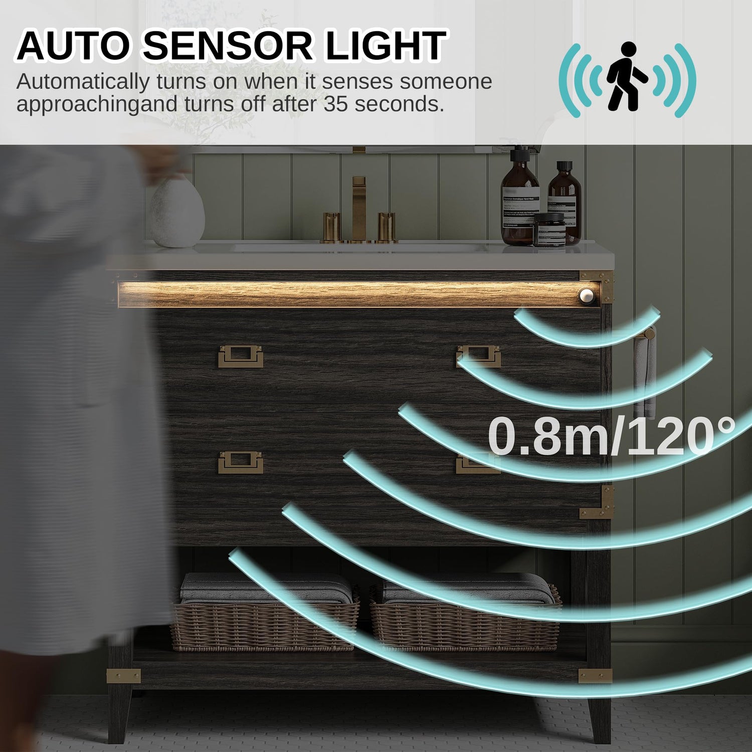 - Motion Sensor Light: Wave goodbye to fumbling in the dark! This 36 inch bathroom vanity with sink features a smart LED light that automatically illuminates as you approach—no switches needed.