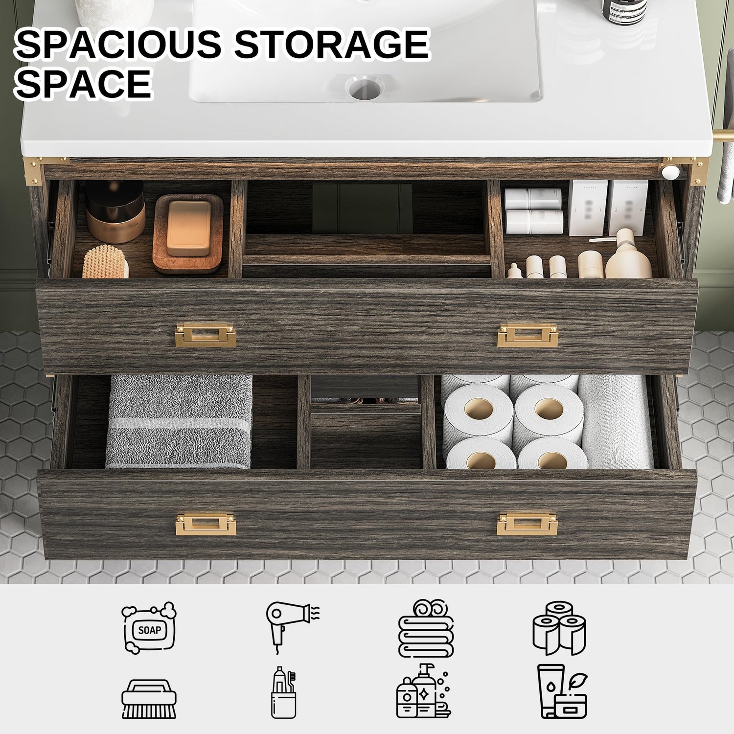 - Exquisite Details: Featuring chic metallic handles,tapered cabinet legs and smooth slides, this 36 bathroom vanity stands out with its attention to detail. Enjoy a touch of modern sophistication every time you reach.