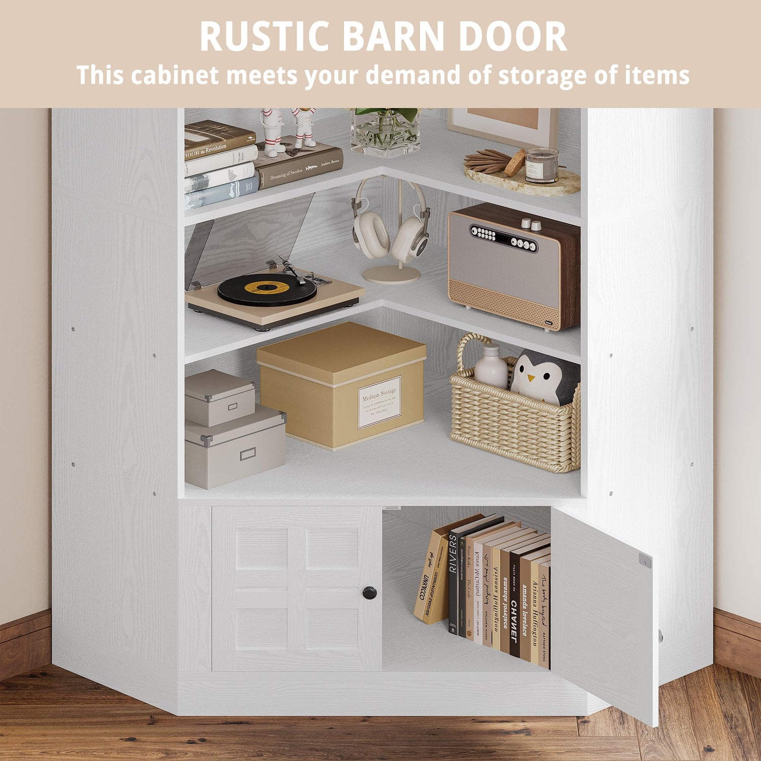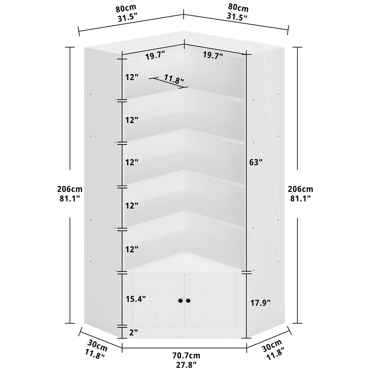 - Maximize Your Space: L-shaped corner shelf maximizing corner usage, providing ample room to organize your essentials. We provide both open and hidden storage. Size: 31.5"D x 11.8"W x 81.1"H