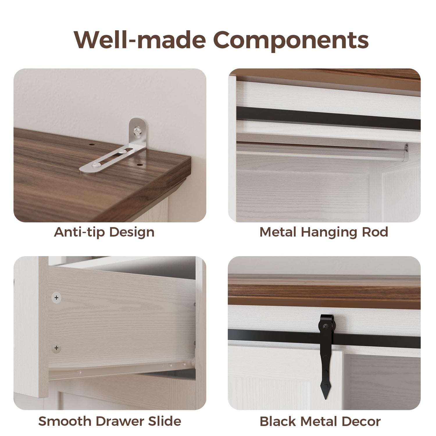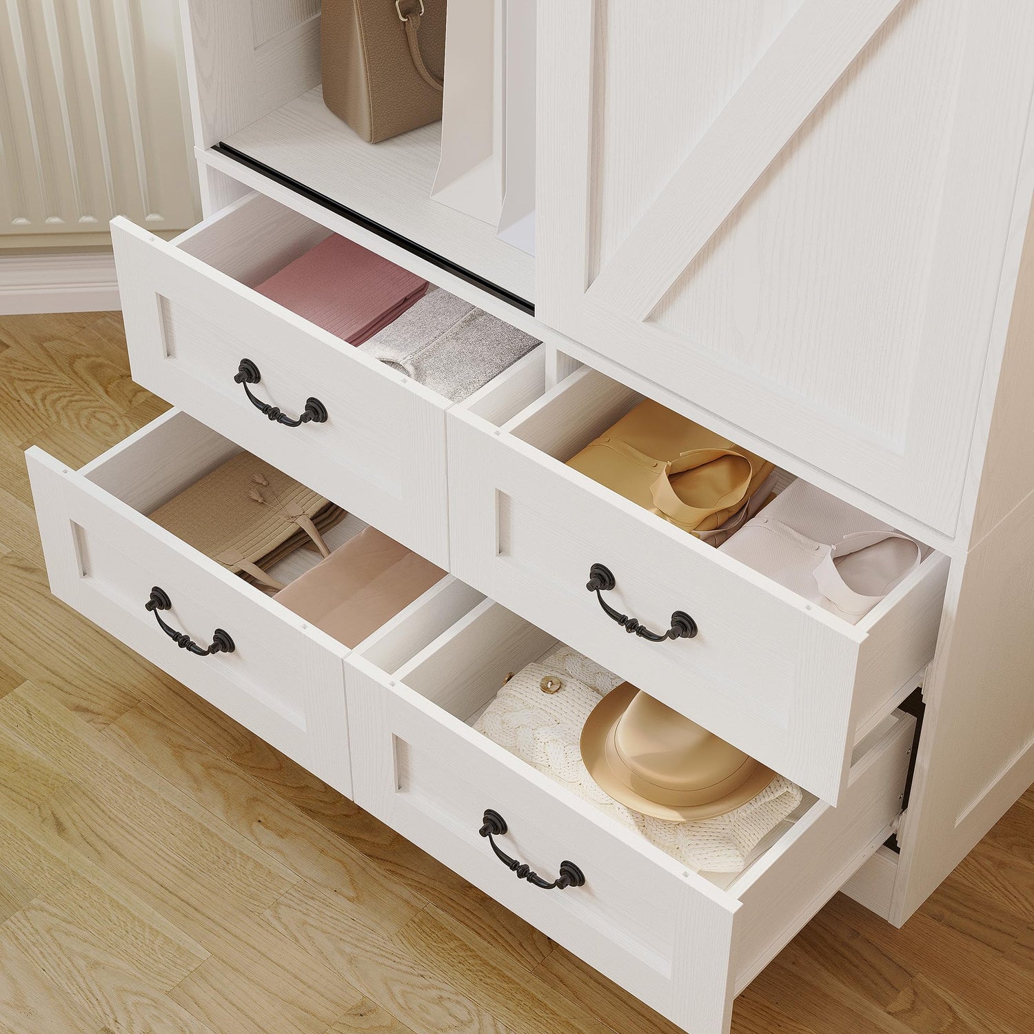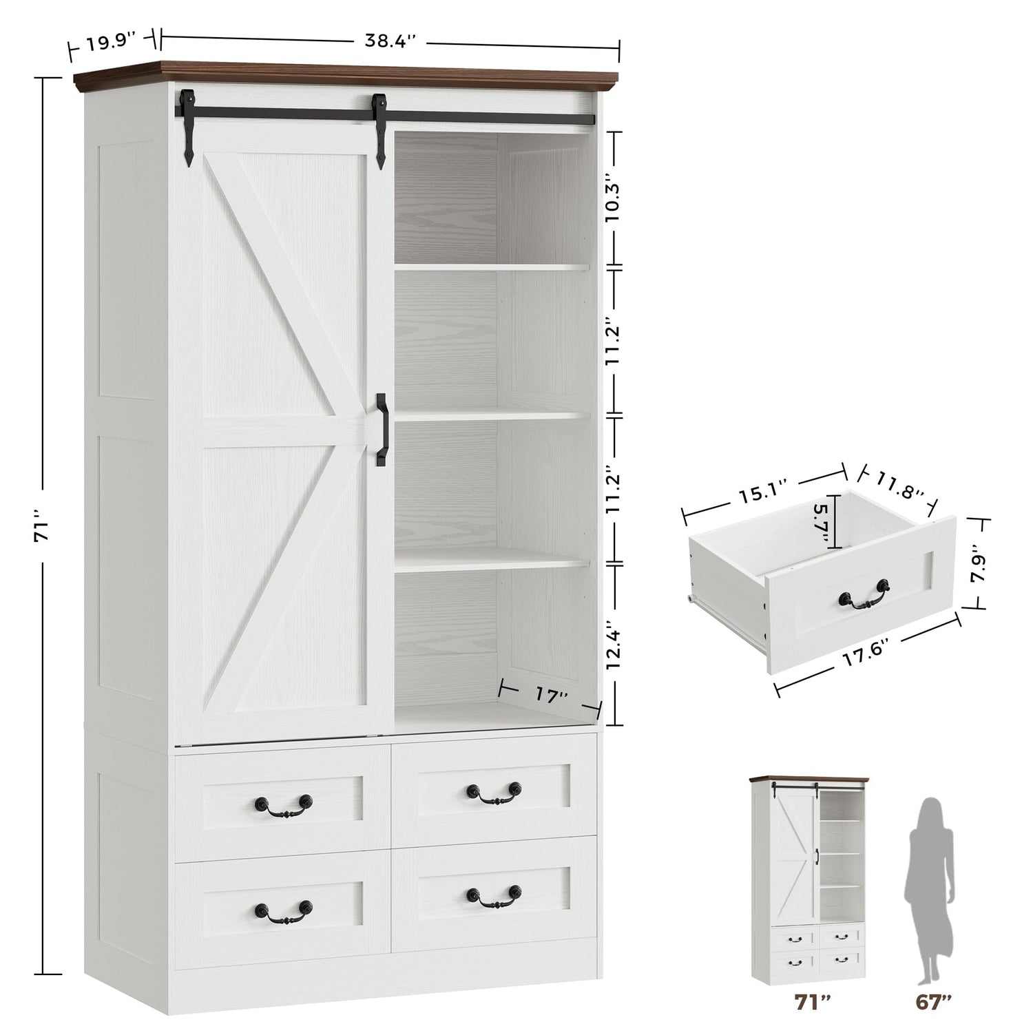 IRONCK Armoire Wardrobe Closet with 4 Drawers,71" Wardrobe Cabinet with Sliding Barn Doors, Tall Clothing Storage Cabinet with Hanging Rod and Shelves for Bedroom, White