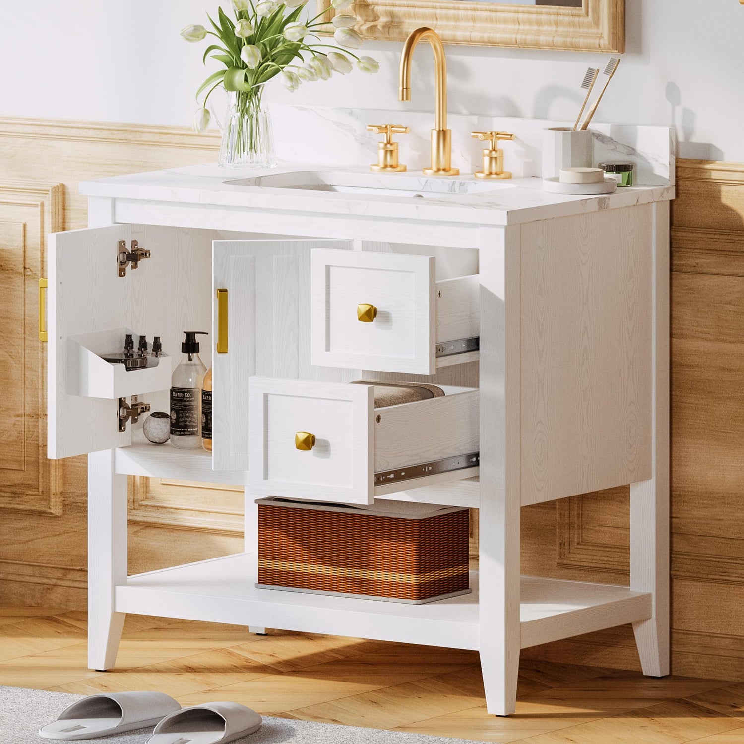 - SPACIOUS STORAGE SPACE: With two drawers and an open storage shelf, this vanity provides ample storage for your bathroom essentials
