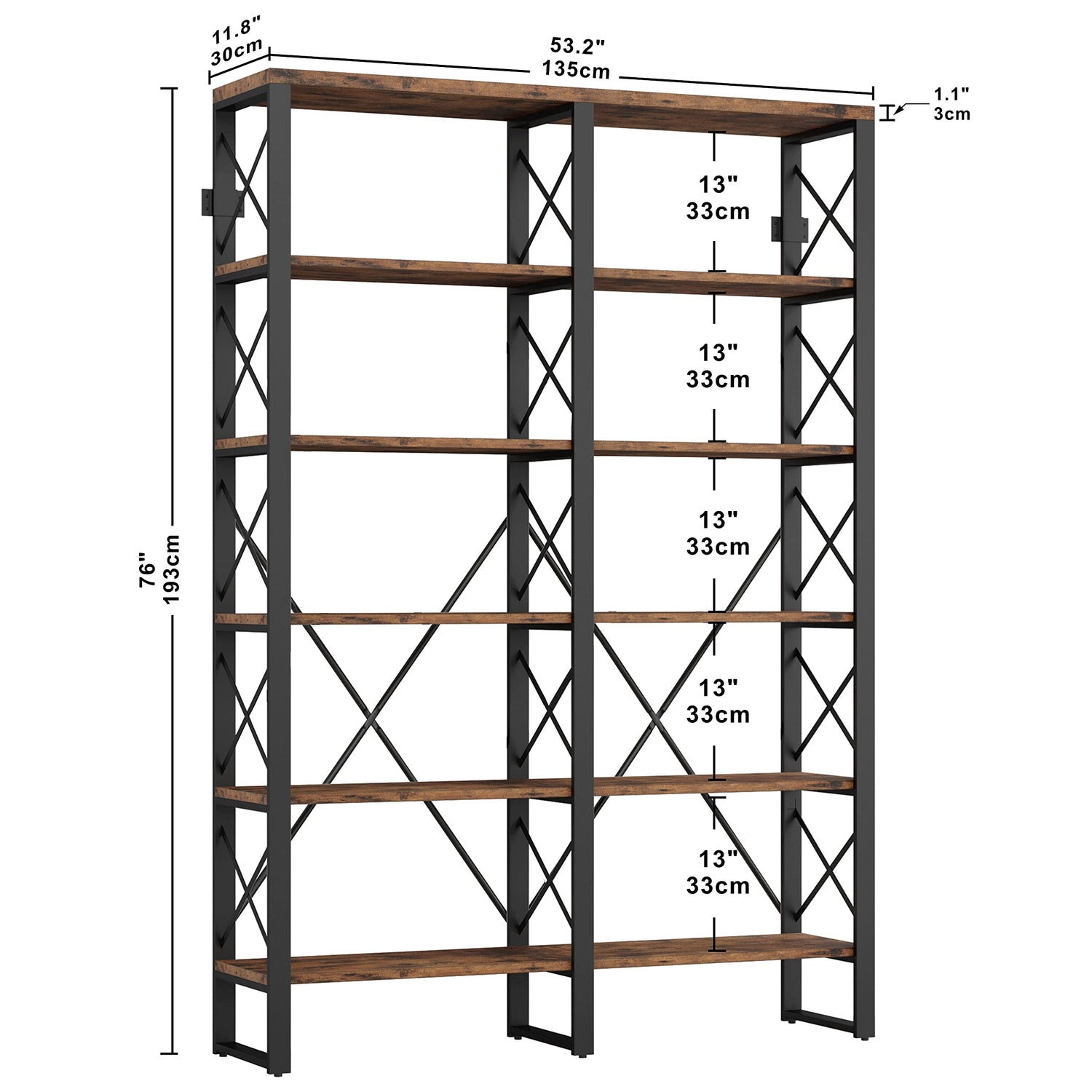 - Large capacity - The bookcase dimension is 53.2"W x 13 D"x 76"H. The clearance between the shelves is 13in. The load capacity of each shelf is 160 lbs.