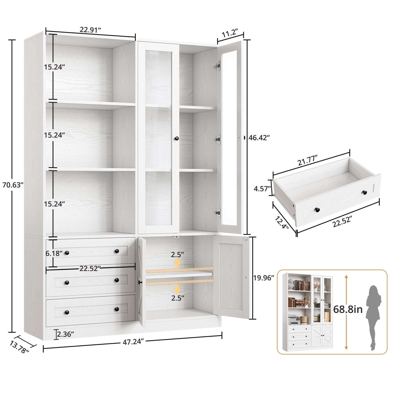 IRONCK Bookshelf with Drawers, 70.63 inch Tall Bookcase with Farmhouse Doors, 6 Tiers Book Shelf with Acrylic Doors, Bookshelves and Bookcases for Home Office, Living Room, Bedroom, White