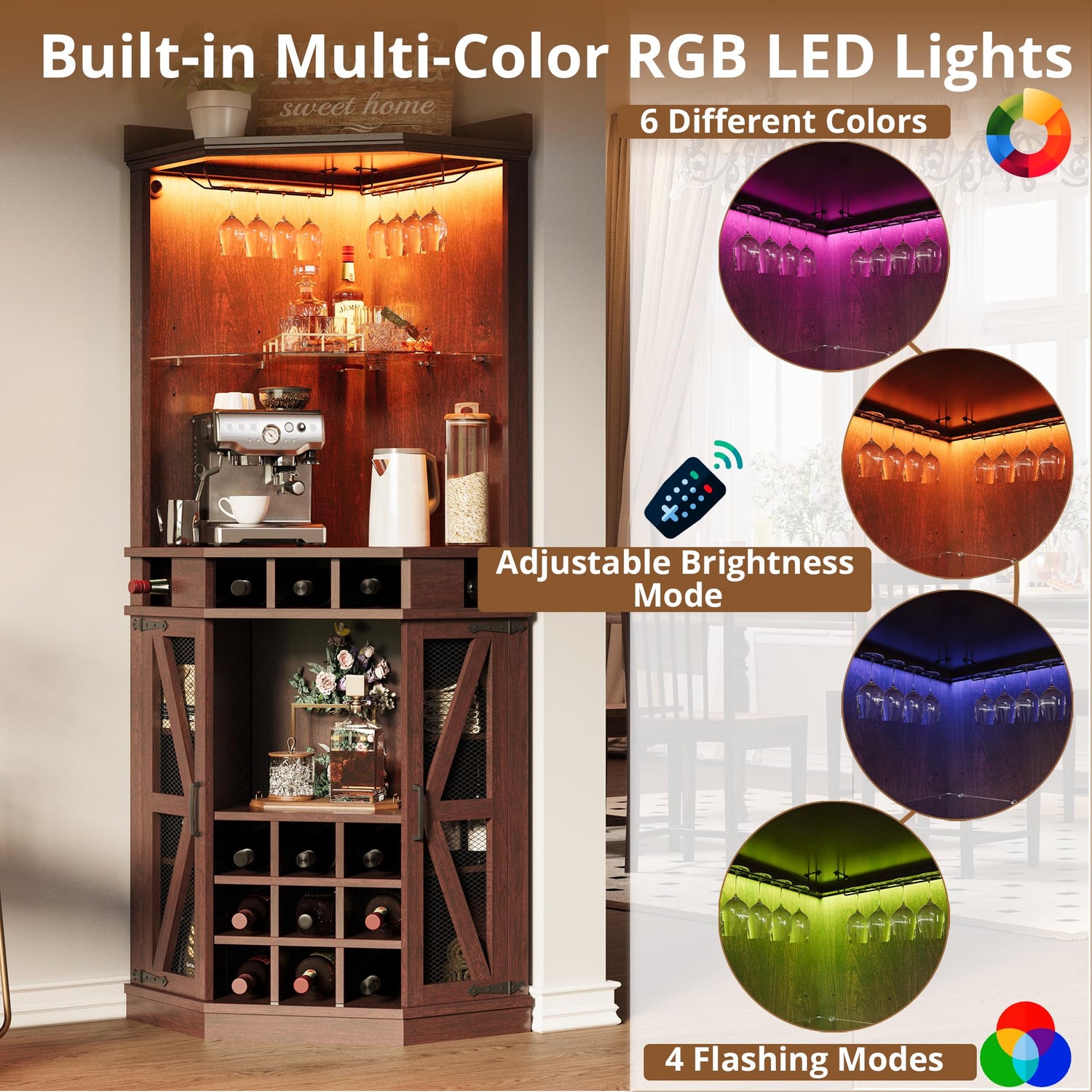 - Enjoy Your Private Home Bar: This tall corner bar cabinet with adjustable RGB LED light strips in 6 colors and flashing modes creates a relaxing and upbeat atmosphere in your room, perfect for home tastings, bars, or showcasing your wine collection. The soft lighting illuminates tall glasses and bottles, making it easy to find what you need without having to fumble around in the dark