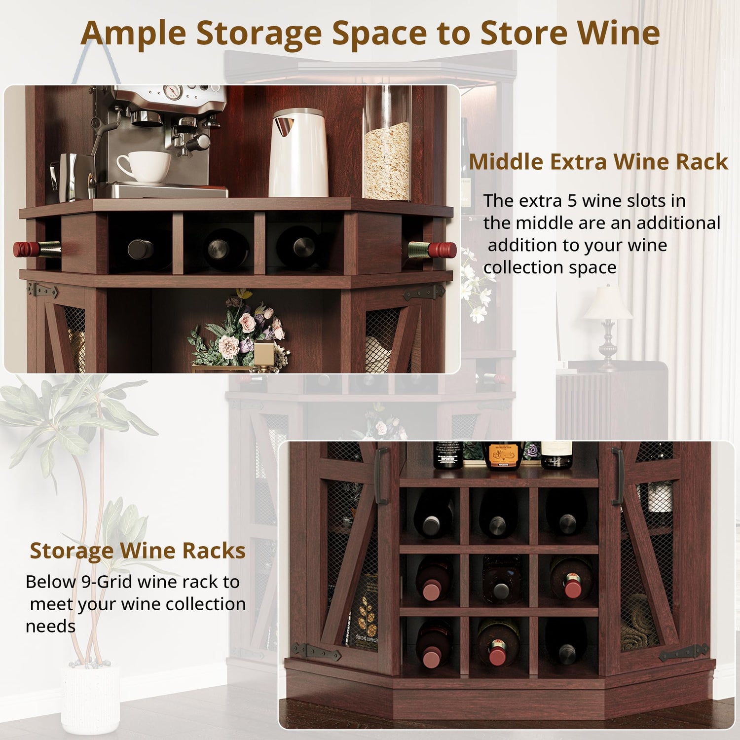 IRONCK Corner Bar Cabinet, 72.4" Tall Wine Cabinet with LED Light & Tempered Glass Rack, Home Bar Liquor Cabinet & Coffee Bar with Barn Door & Adjustable Shelf for Living Room, Dining Room, Red Walnut