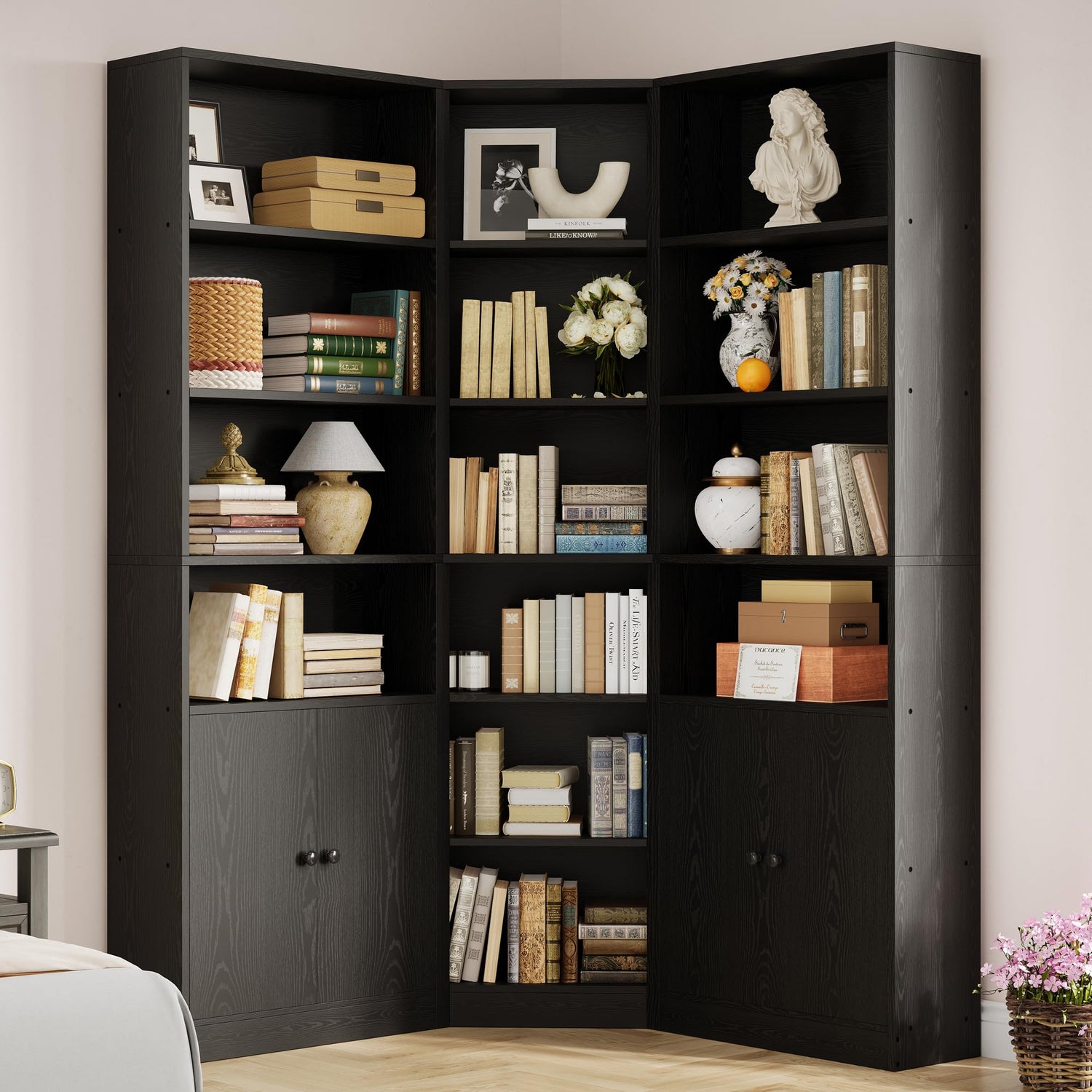 IRONCK Corner Bookshelf and Bookcase with 2 Storage Cabinets and 7 Tier Shelves, 71" Height Storage Shelves Corner Combination, Black