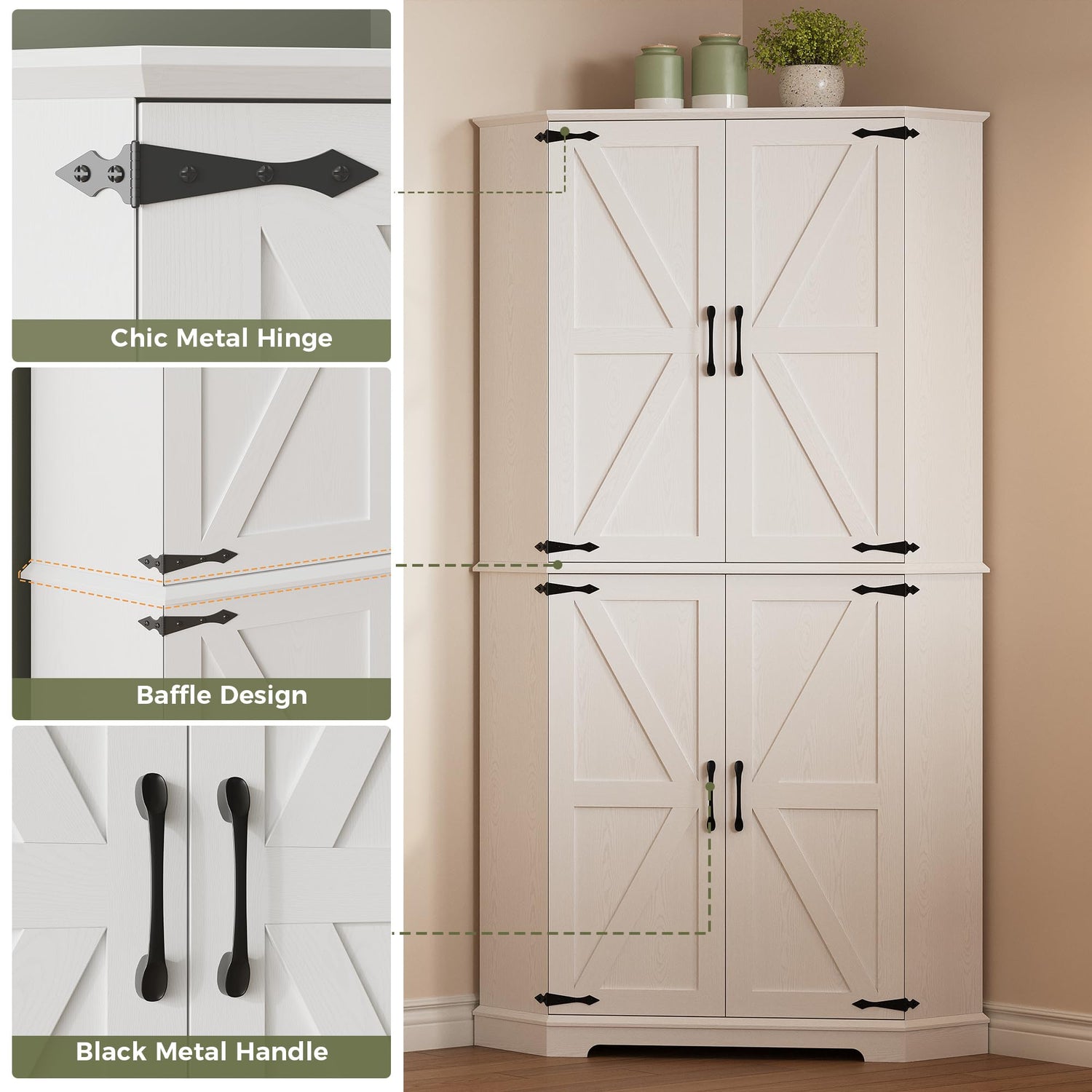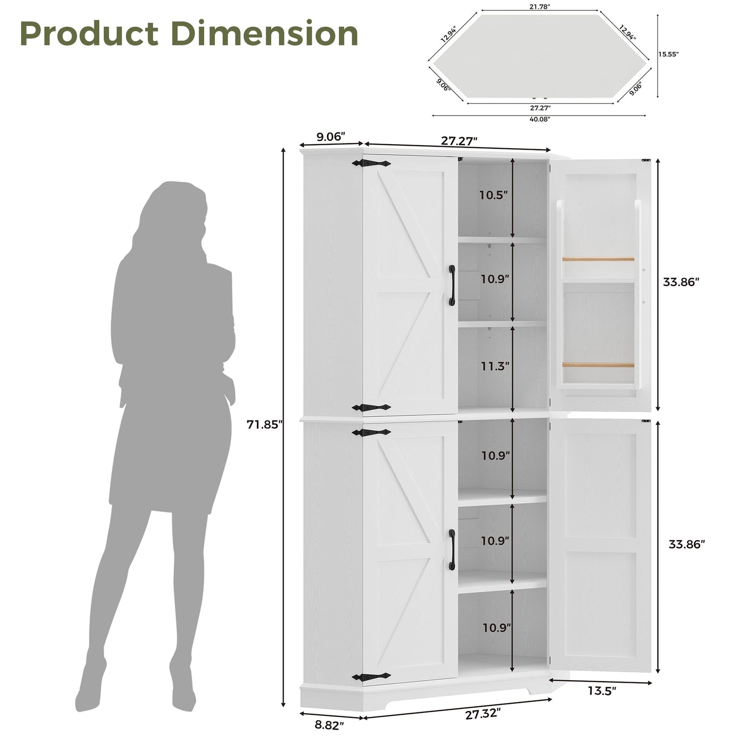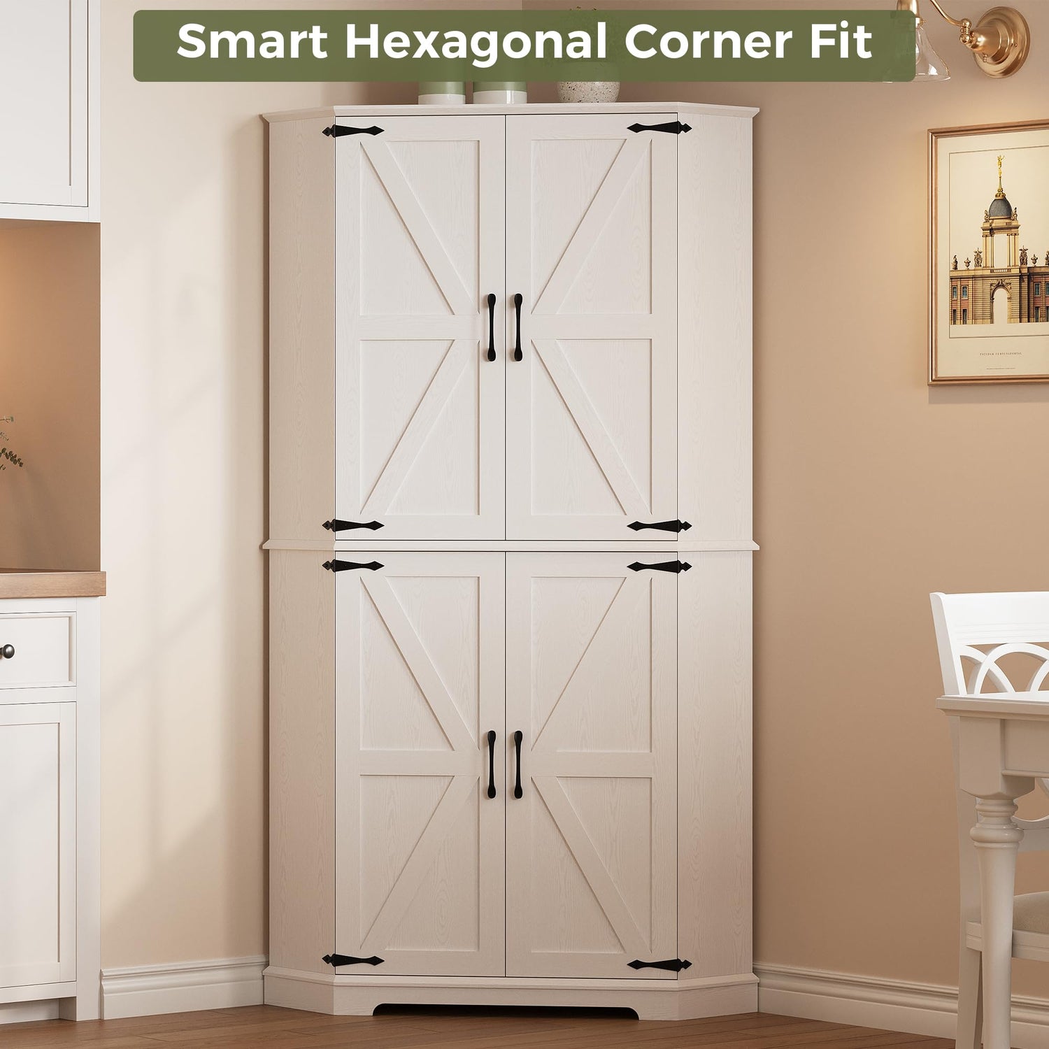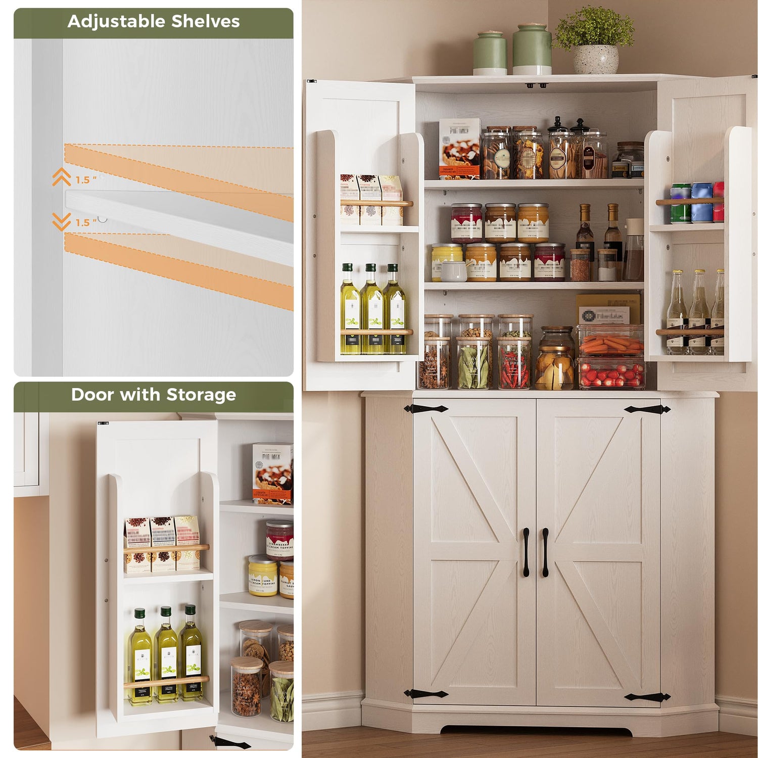 IRONCK Corner Cabinet, 72" Kitchen Pantry Cabinet, 6-Tier Freestanding Farmhouse Pantry with 4 Adjustable Shelves, 240°Swivel Doors, 2 Doors Storage, Spacious Hutch for Kitchen, Living Room, White