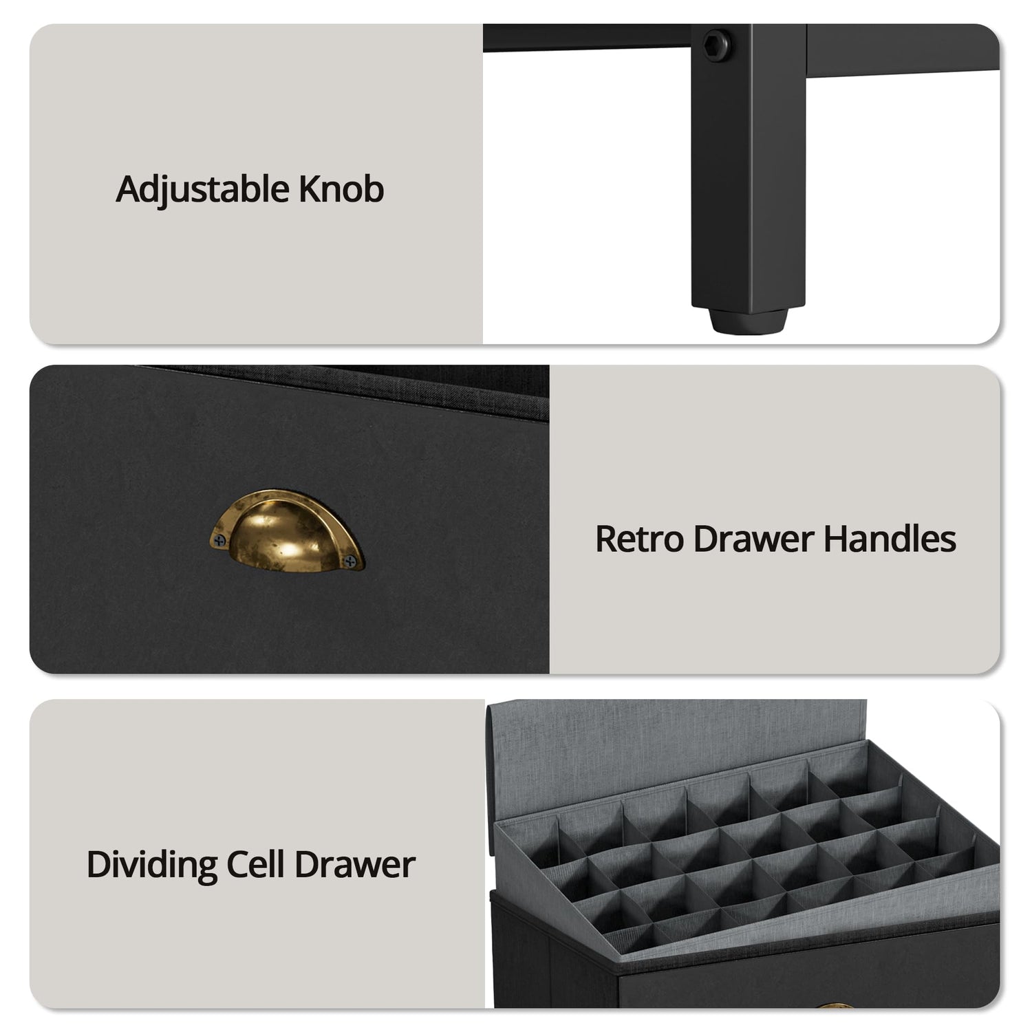 - Upgraded Material Drawer: The drawers of the dresser are made of black PU leather, which is more durable and more advanced than ordinary cotton and linen