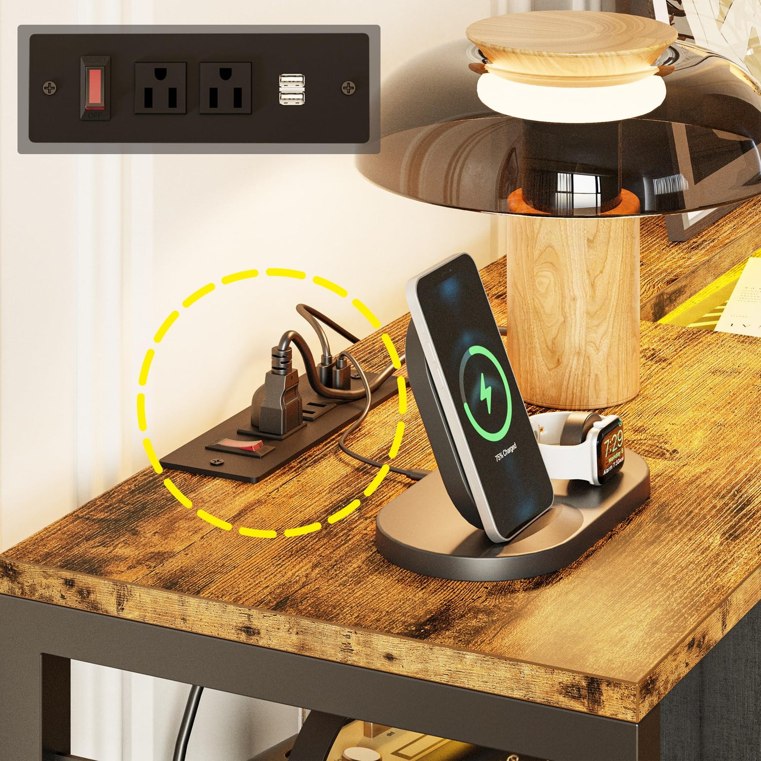 - Useful Functions: It is equipped with a built-in charge station for more convenience to charge your mobile phone, desk lamp, etc.And adding 3-color light strips (white, warm white, warm color) for the atmosphere