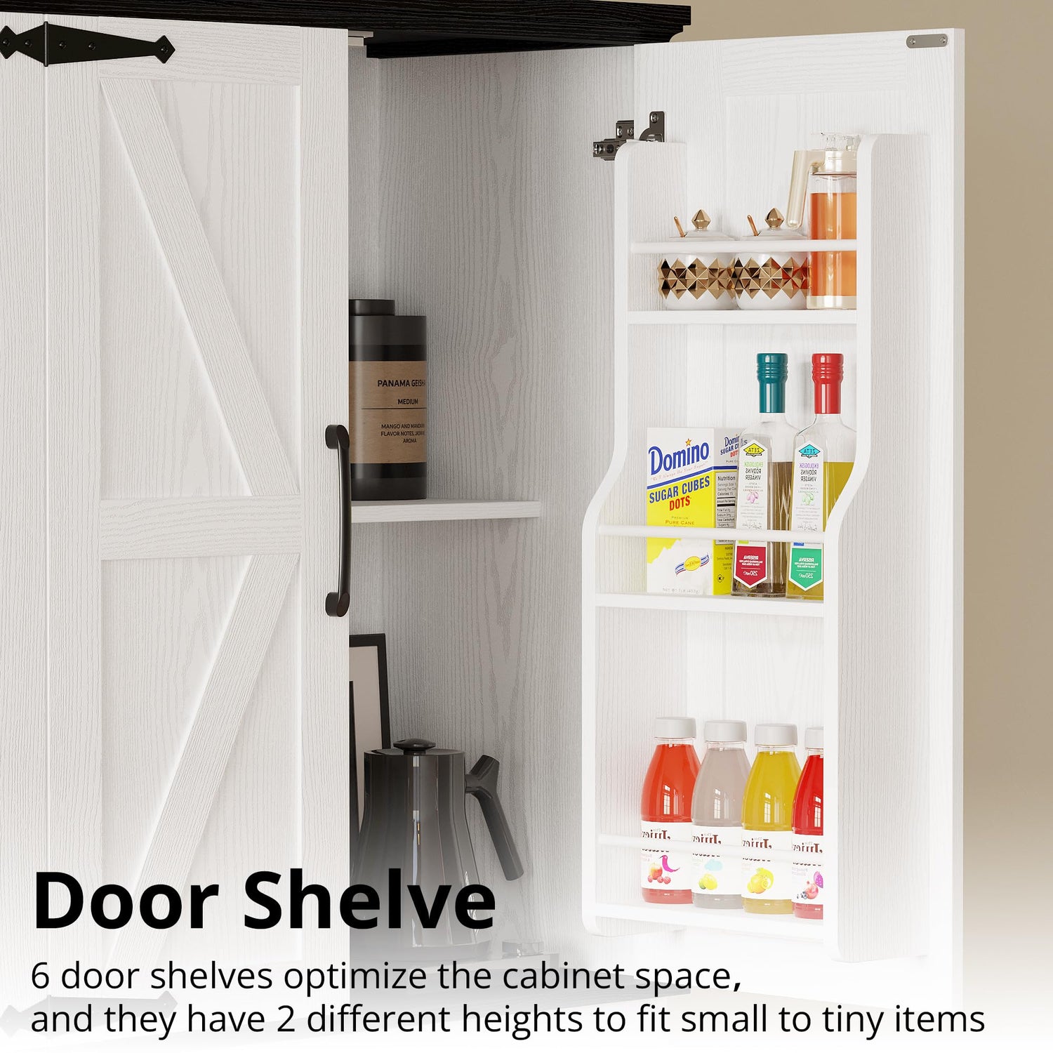 IRONCK Farmhouse Kitchen Pantry Cabinet, Tall Storage Cabinet with 6 Hanging Shelves and Adjustable Shelves, Freestanding Cupboard with Barn Doors for Kitchen, Dining Room,White/Black