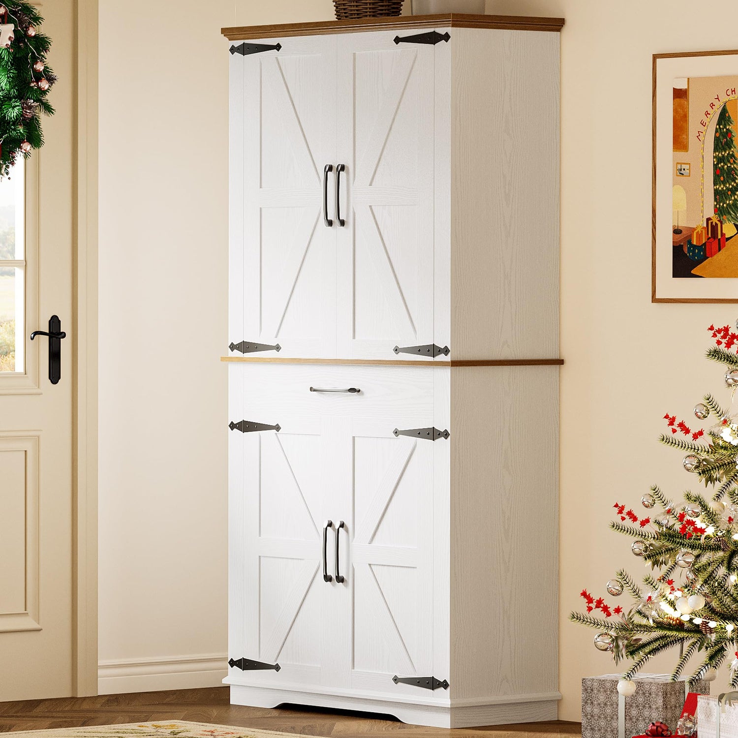 IRONCK Farmhouse Kitchen Pantry Cabinet, Tall Storage Cabinet with 6 Hanging Shelves and Adjustable Shelves, Freestanding Cupboard with Barn Doors for Kitchen, Dining Room, White/Walnut