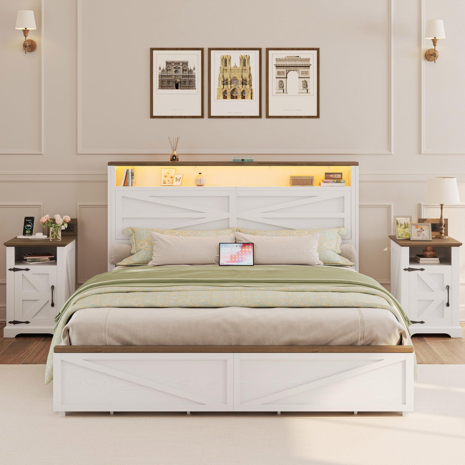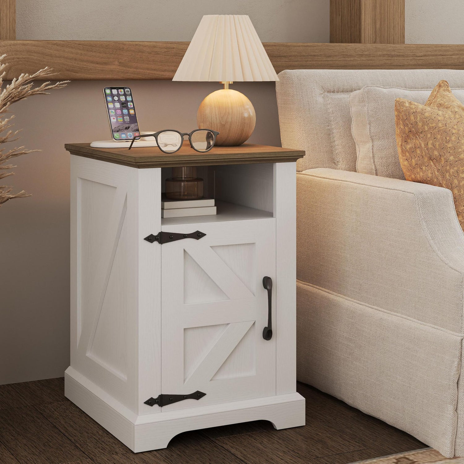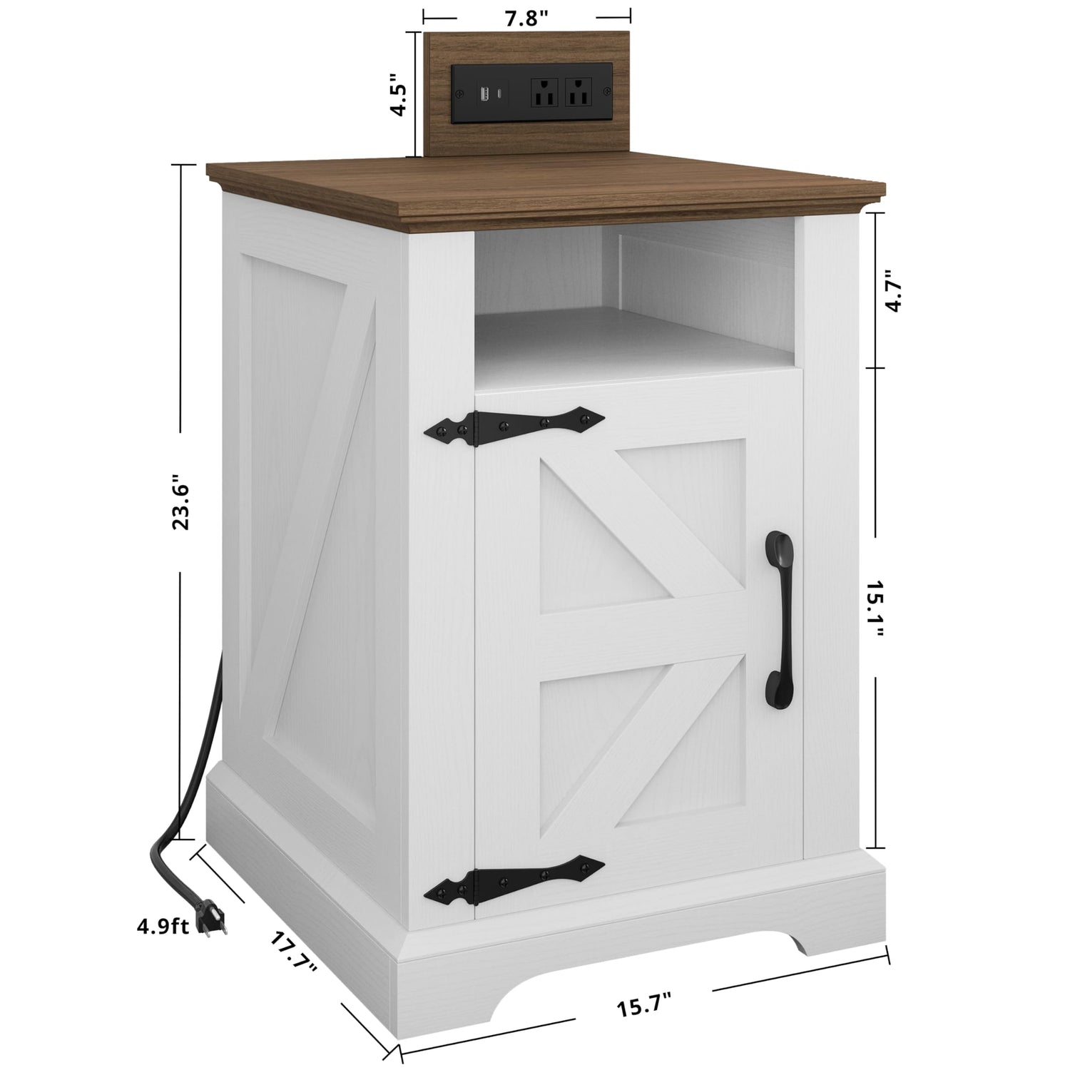 IRONCK Farmhouse Nightstand with Charging Station, Rustic Night Stand with Barn Door and Shelf, Rustic End Table Side Table with Storage for Bedroom, White/Walnut