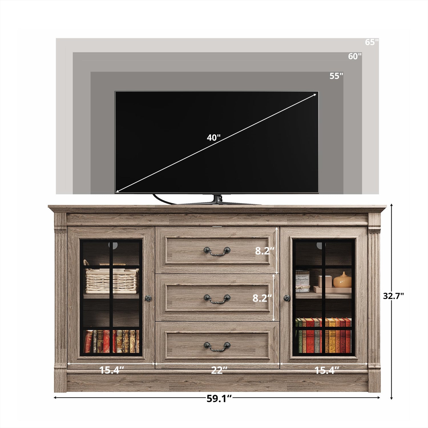 IRONCK Farmhouse TV Stand for 65 Inch TV with Outlets, 59" Entertainment Center with 3 Drawers and 2 Storage Cabinet, Glass Doors and Adjustable Shelf, Console Tables for Living Room, Light Rustic Oak