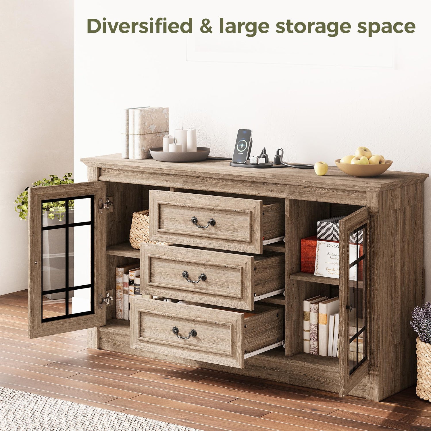 - Ample Storage Space: Keep your entertainment centre organised with 3 sliding drawers and 2 side cabinets with glass doors and adjustable shelves. The farmhouse style Tv stand includes soft-close hinges and metal drawer slides for smooth everyday use.