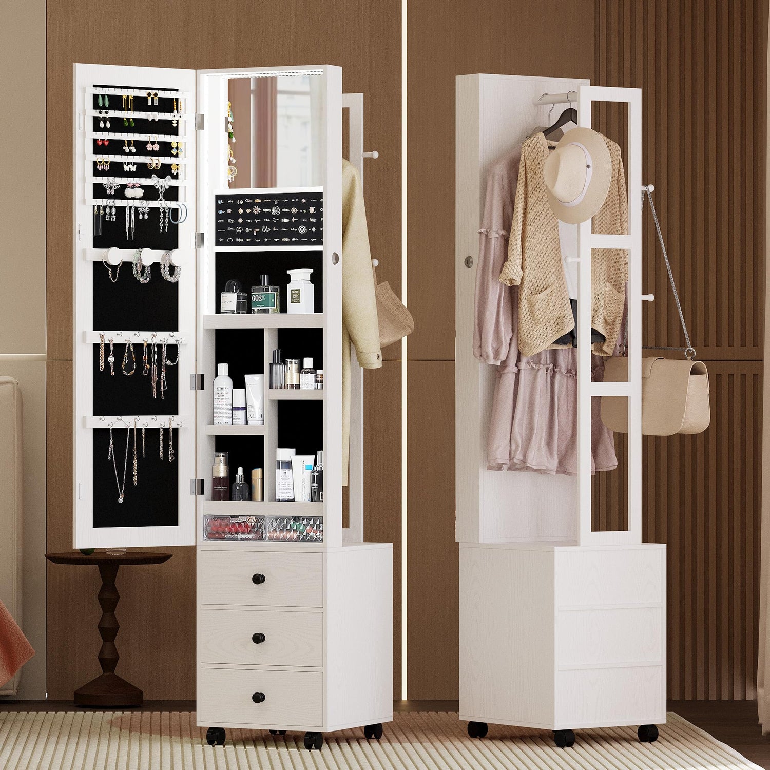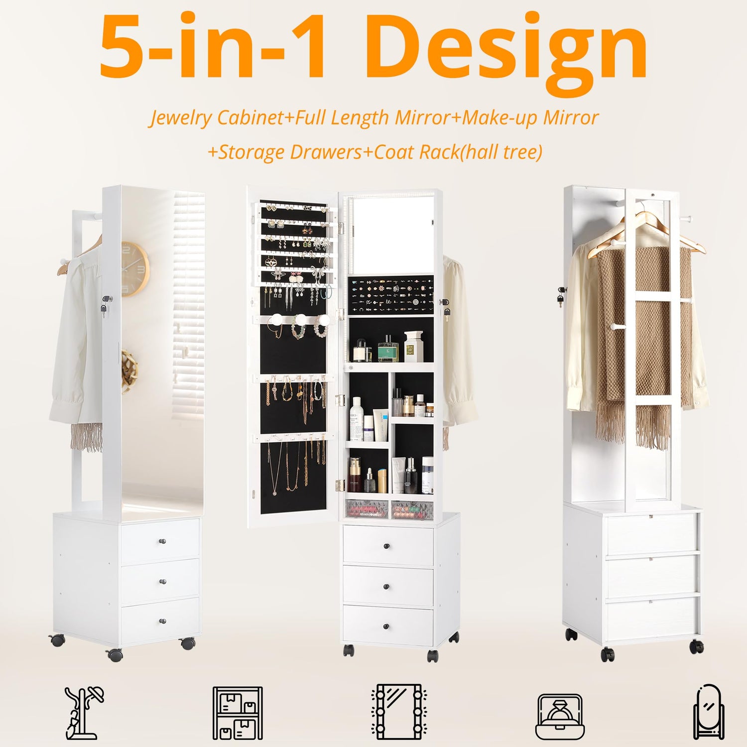 - Five-in-One Space Saving Jewelry Organizer: It has a full-length mirror, vanity mirror, and 3 storage drawers, a garment rack to let your jewelry, your makeup, your bags, your clothes have their own storage space in one place
