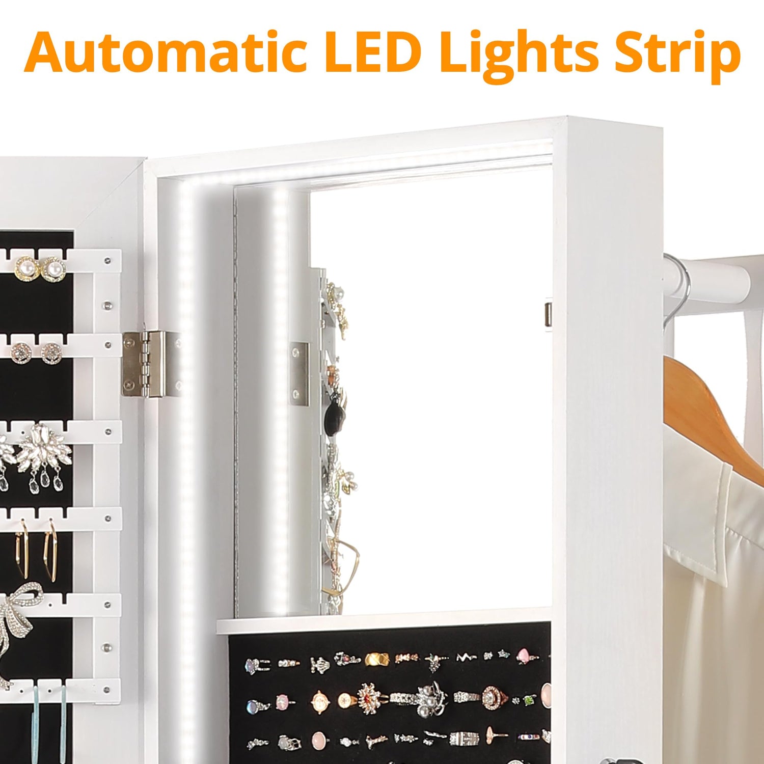 - Built-In Mirror with LED Lights Strip: The high-quality LED-lit mirror makes it easy to put on jewelry and apply makeup without constantly walking back and forth to the vanity