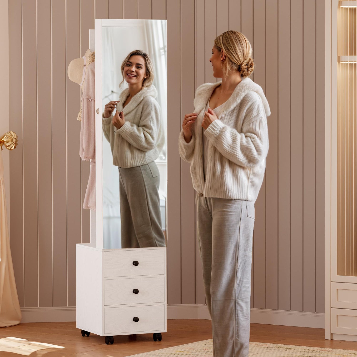 IRONCK Jewelry Cabinet with 3 Drawers, Lockable Standing Jewelry Armoire Organizer with Garment Rack, Full Length Mirror with Jewelry Storage and 4 Wheels for Bedroom, Cloakroom, White