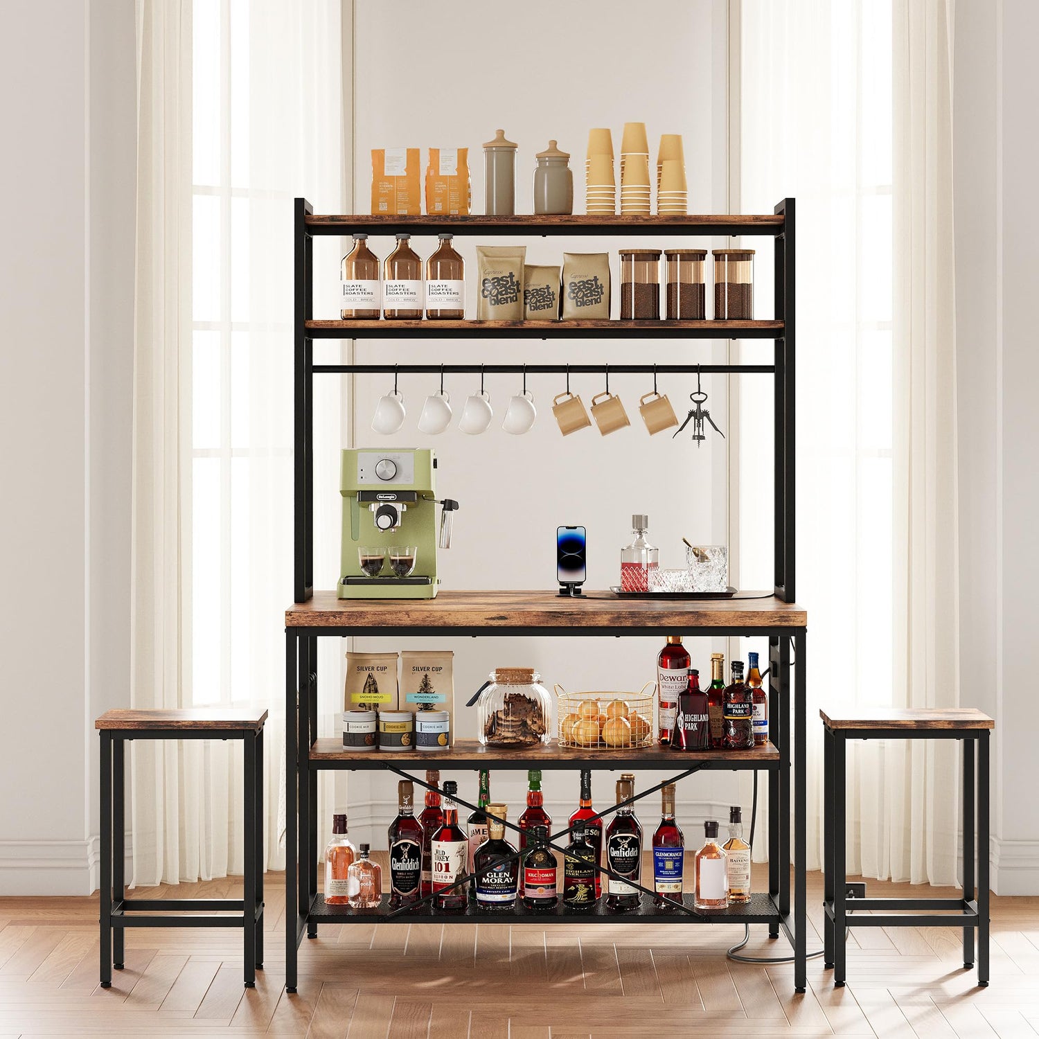 IRONCK Kitchen Island with Stools, Dining Table Set with Storage and Power Outlet, Industrial Coffee Bar Table for Kitchen Dining Living Room, 10 Hooks (Vintage Brown)