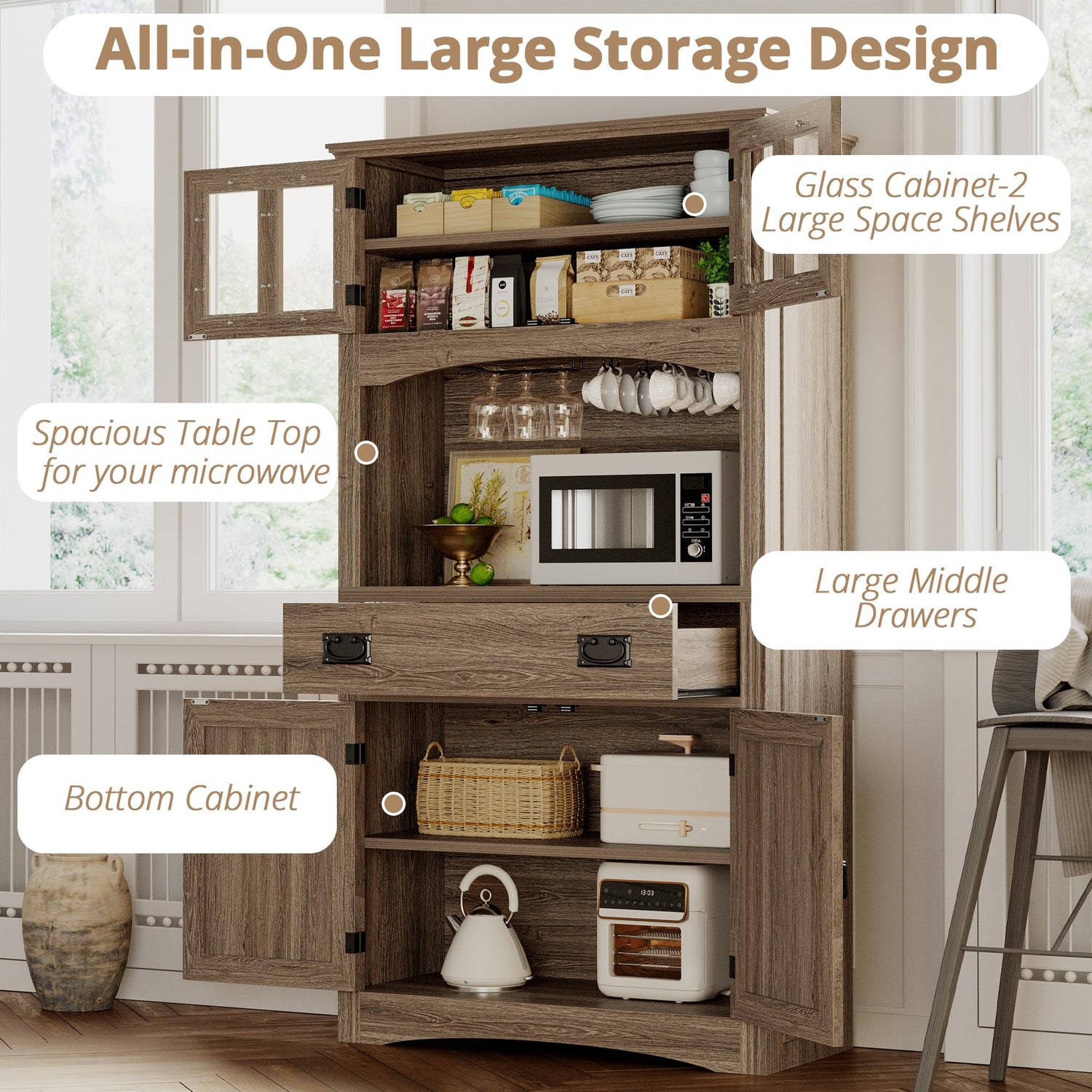 - FARMHOUSE VINTAGE DESIGN: Crafted with embossed textures, scratch-proof 3D wood finish, and elegant glass doors, this Kitchen Pantry emanates sophistication. Its rustic charm and natural wood grain infuse warmth, authenticity, and a nostalgic touch into any space setting.