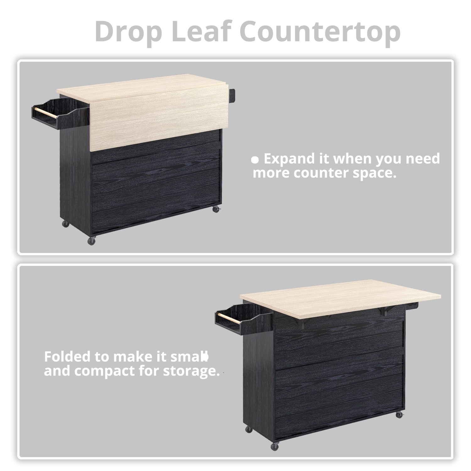 - with Drop Leaf Top: when the drop-leaf is expanded, you can enjoy your dinner at the table, when dropped down, and it will become a multipurpose kitchen trolley. unfold the drop-leaf board: 26.8"D x 39.4"W; fold the drop-leaf board: 15.4” D x 39.4"W