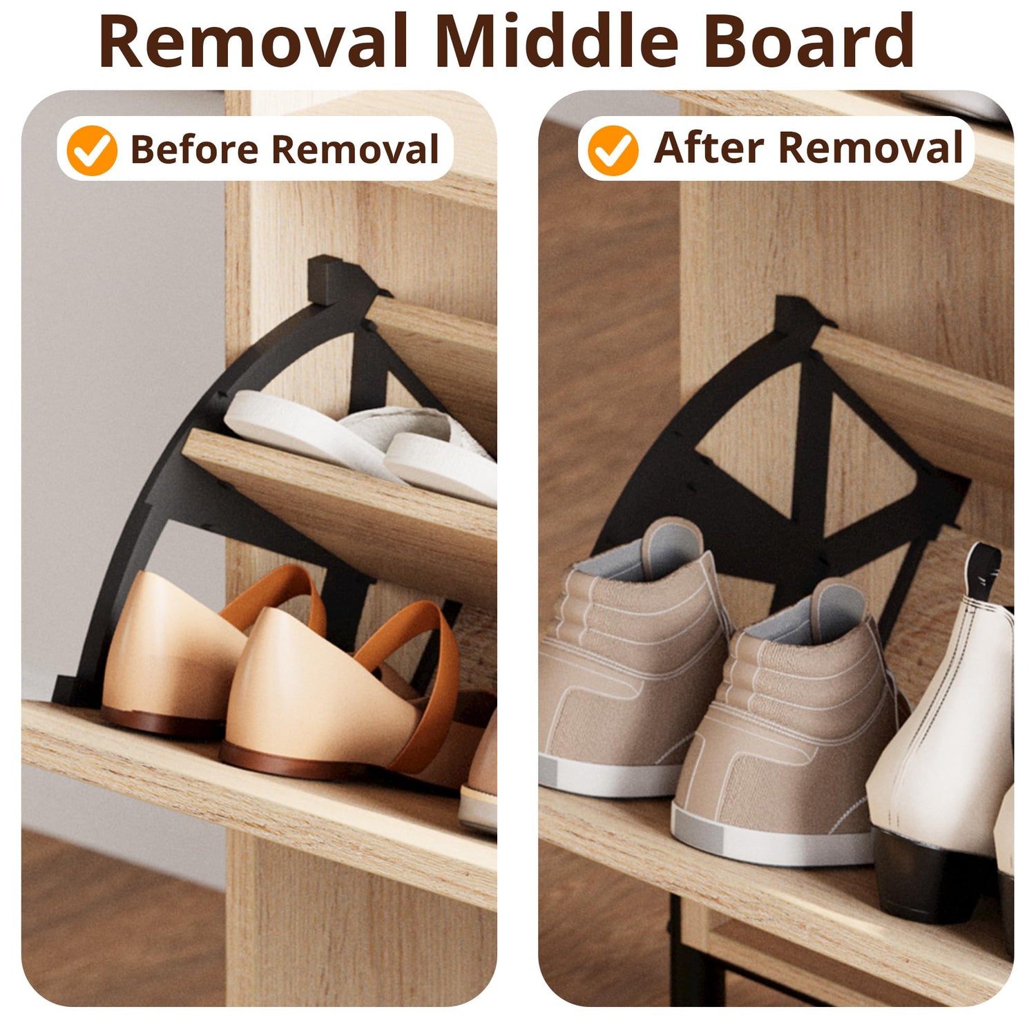 - FLEXIBLE & LARGE CAPACITY: This shoe cabinet features two flip-top drawers, each with two levels. The center divider in each drawer can be adjusted or removed to fit various shoe sizes, accommodating up to 22-35 pairs. The top surface offers ample storage for picture frames, keys, wallets, and more