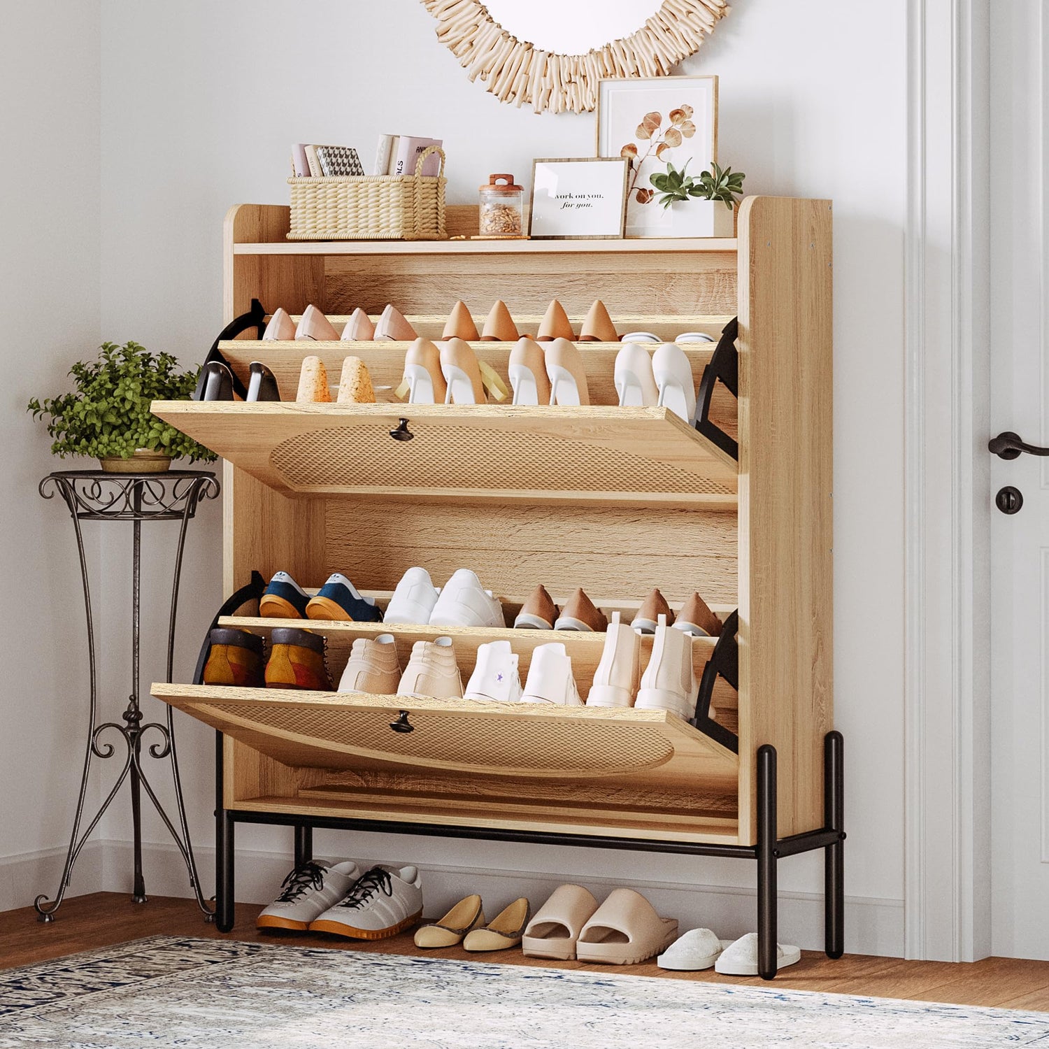 IRONCK Shoe Cabinet Storage with 2 Flip Drawers, Free Standing Wooden Shoe Storage Organizer Cabinet with Rattan Doors for Entryway, Narrow Shoe Rack Cabinet, Oak