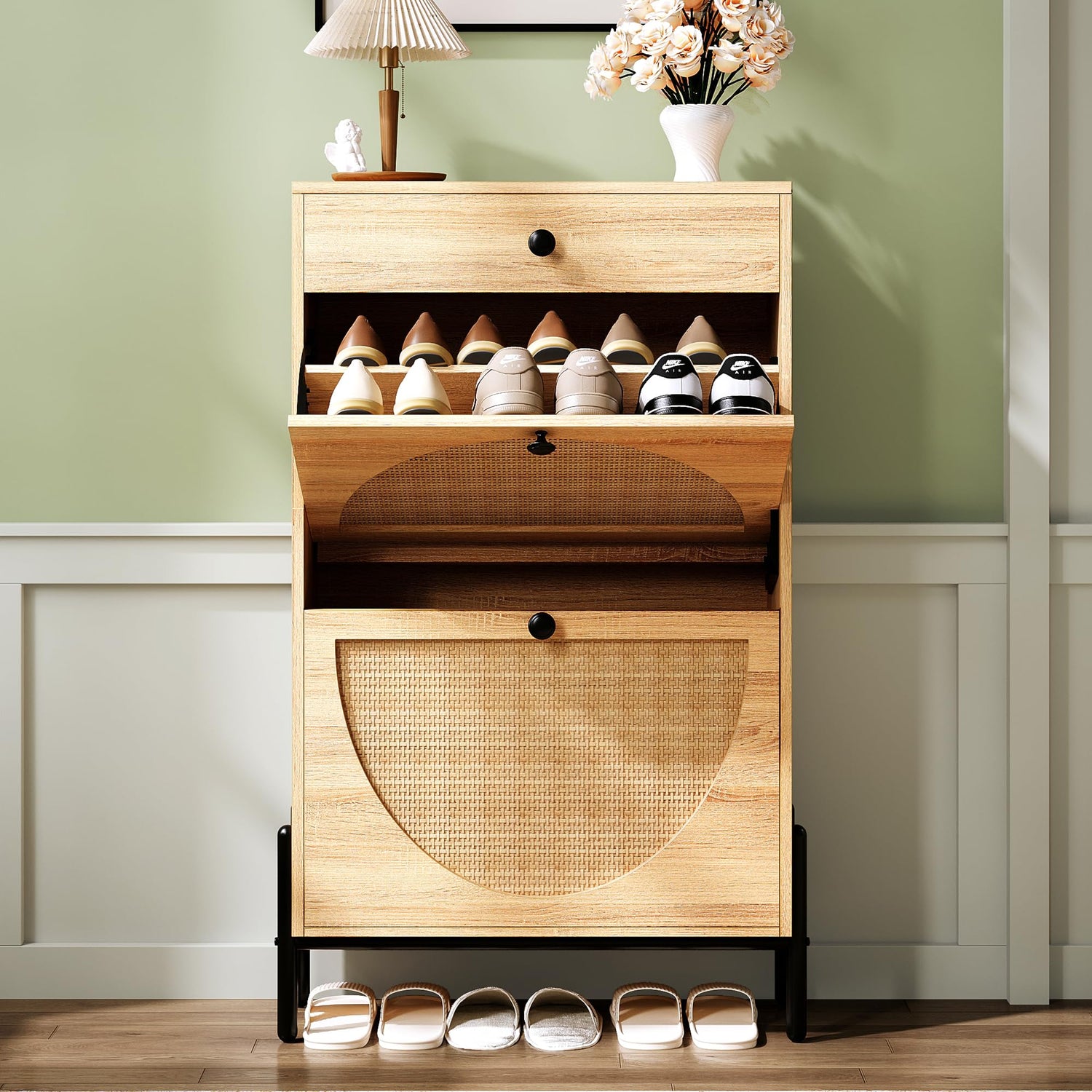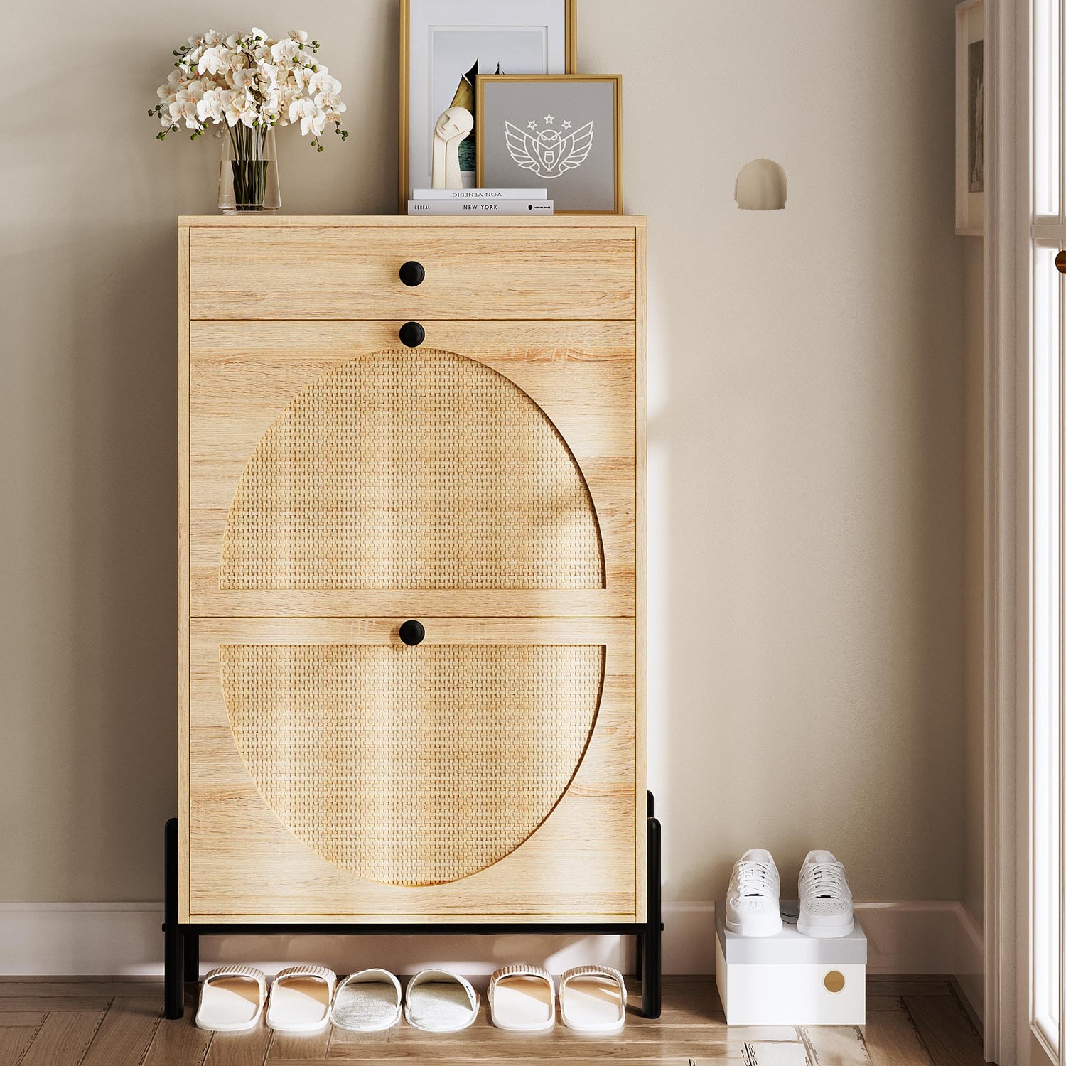 IRONCK Shoe Cabinet with 2 Flip Drawers, Shoe Storage Cabinet for Entryway, Free Standing Shoe Storage Organizer with Rattan Doors Slim Narrow Shoe Rack Cabinet, Oak