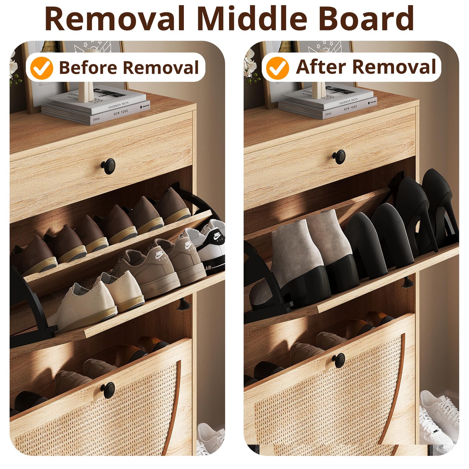 - VERSATILE & SPACIOUS: This shoe cabinet boasts two flip-top drawers, each with two tiers. The center divider in each drawer can be adjusted or removed to fit various shoe sizes, accommodating up to 22 pairs. The top surface and small drawer provide ample storage for items like picture frames, keys, glasses, and other small objects.Additionally,the bottom compartment is ideal for storing slippers and boots.