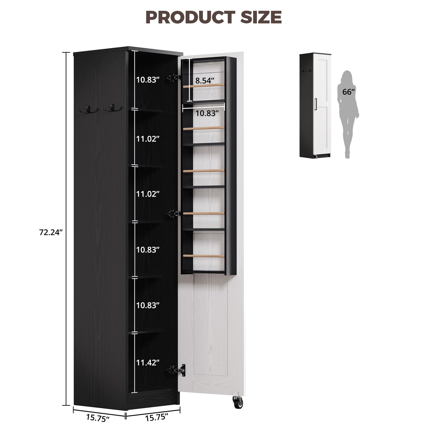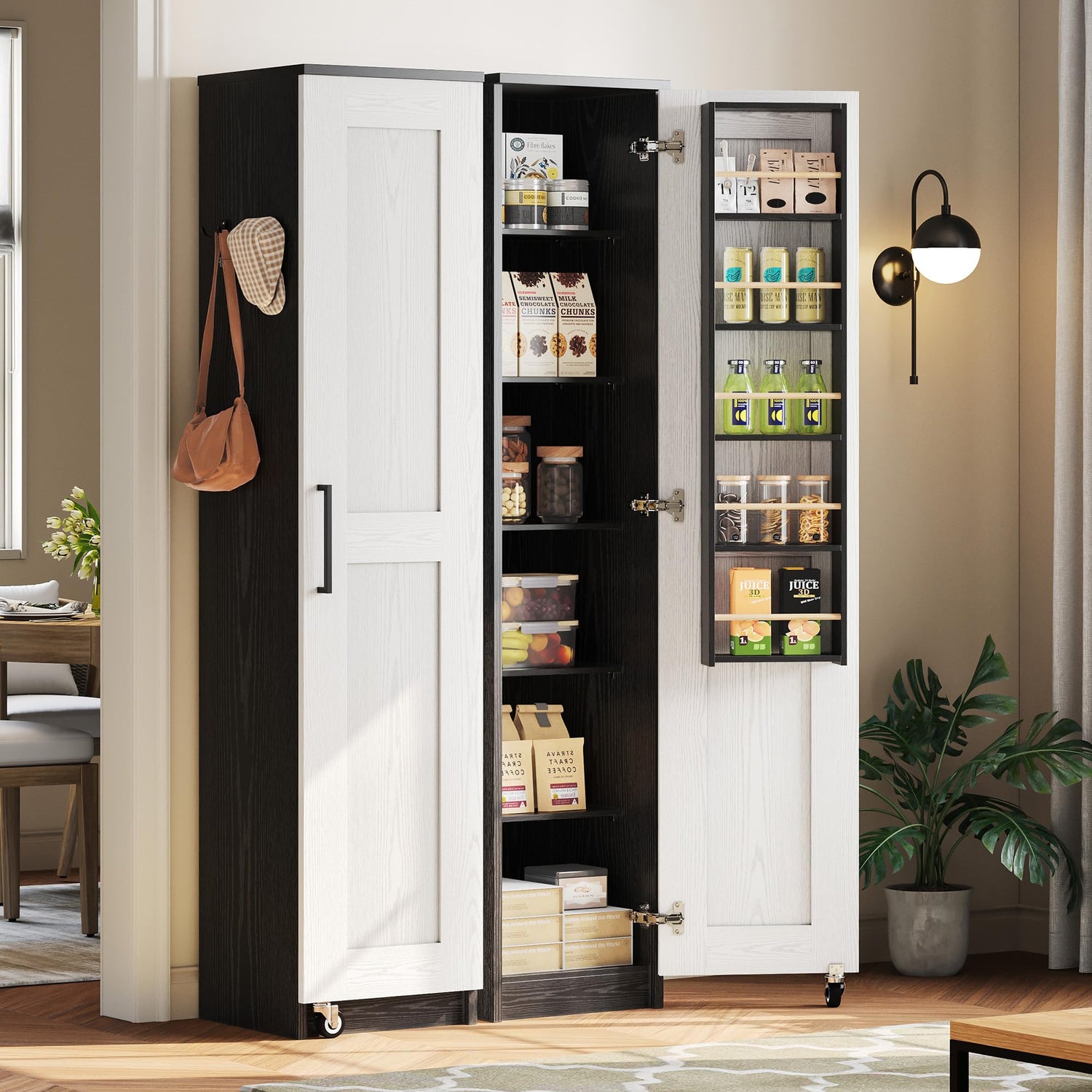 IRONCK Small Kitchen Pantry Cabinet 72" for Small Space, with Single Door and Adjustable Shelves, Freestanding Storage Cabinet for Living Room, Bathroom, Black and White