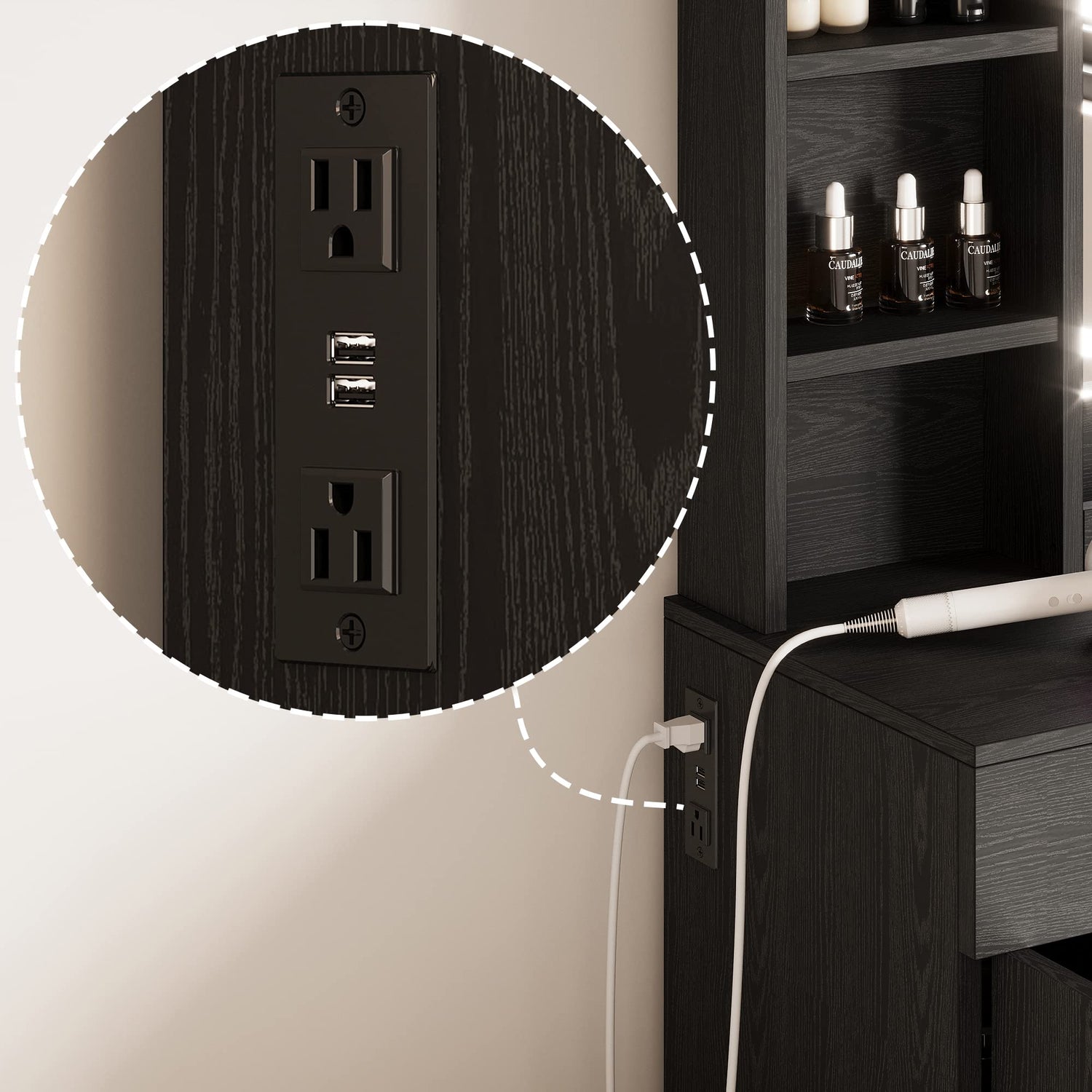 - Vanity Table with Charging Station: This makeup vanity features a charging station, includes two standard plug sockets and two USB ports, which can be more convenient to connect your hair dryer, and curling iron, and it can also charge your phone, tablet or other mobile devices, allowing you to take a beautiful selfie when you finished your makeup