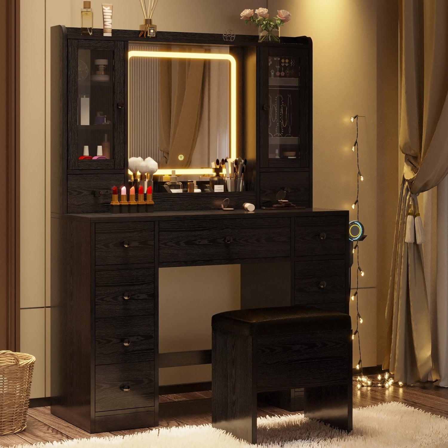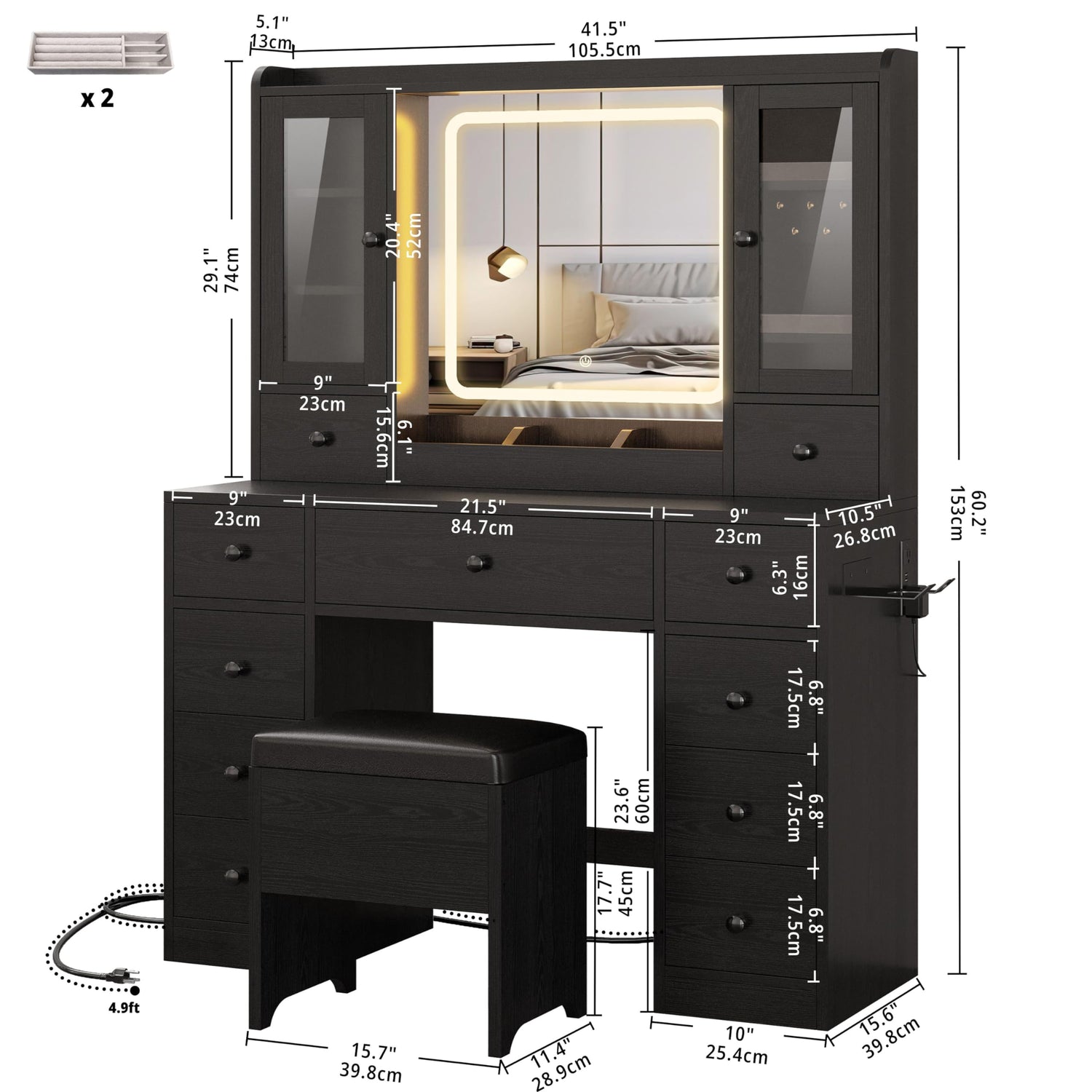 IRONCK Vanity Desk with LED Lights Mirror and Charging Station, Makeup Vanity Table with Jewelry Armoire, Storage Bench, and 11 Drawers,Black