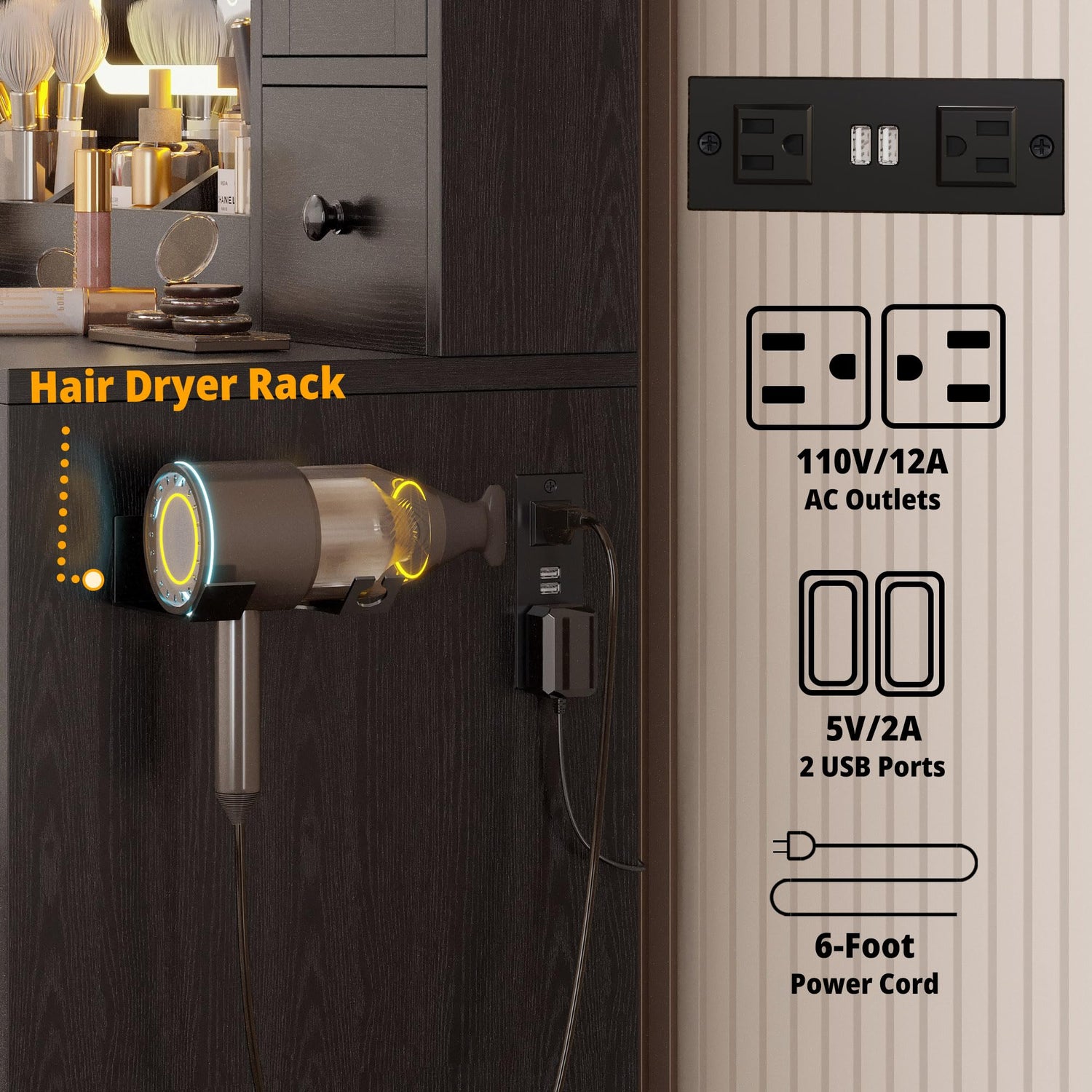 - With Charging Station: There is a built-in charging station in the side space, including 2 standard plug sockets and 2 USB ports, making it convenient to charge your devices and use beauty tools. Applying makeup becomes easier and more efficient.