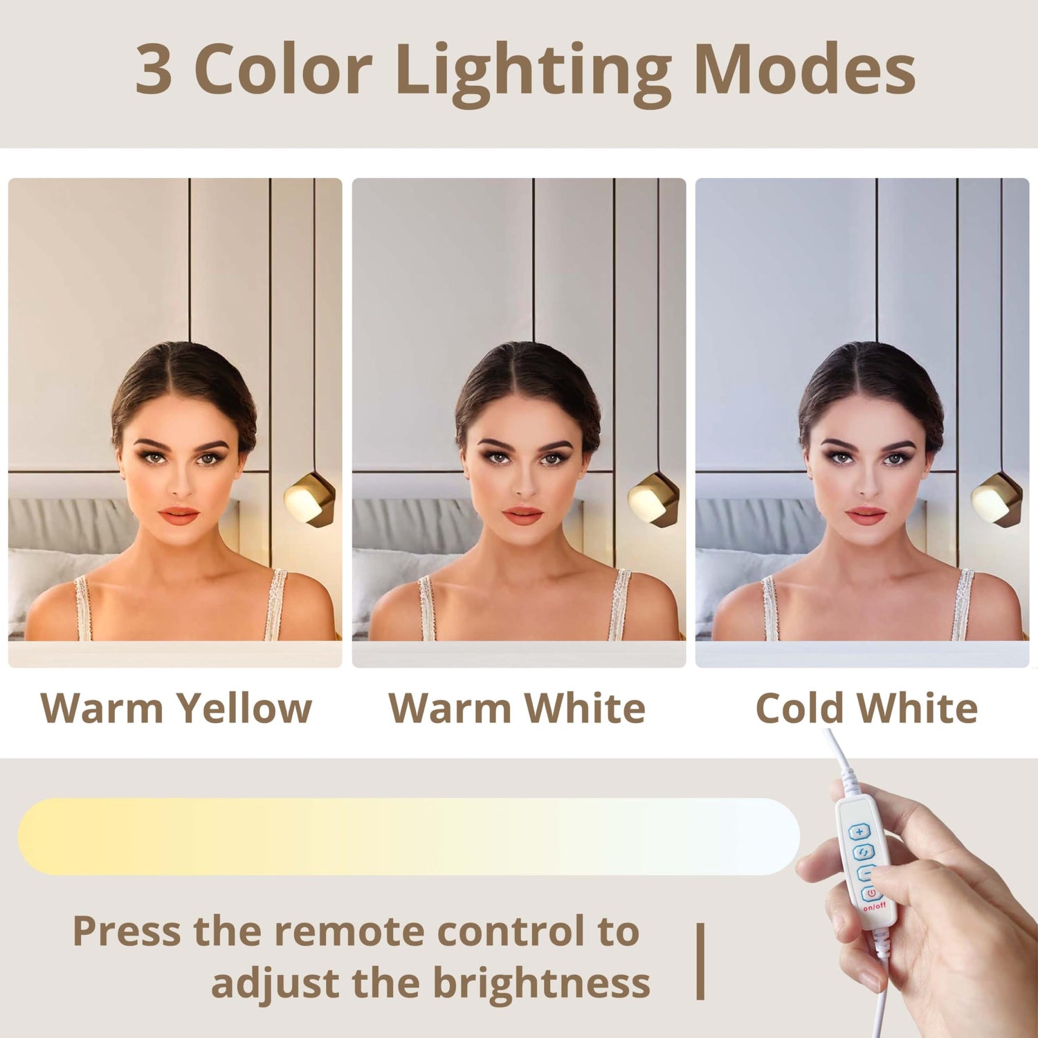 - 3-Color Lighting Makeup Mirror: The makeup mirror is equipped with 10 light bulbs and offers three color modes: warm yellow, warm white and cool white. You can easily adjust the brightness and color of the light with the buttons according to your preference and makeup needs, bringing you an exquisite makeup experience