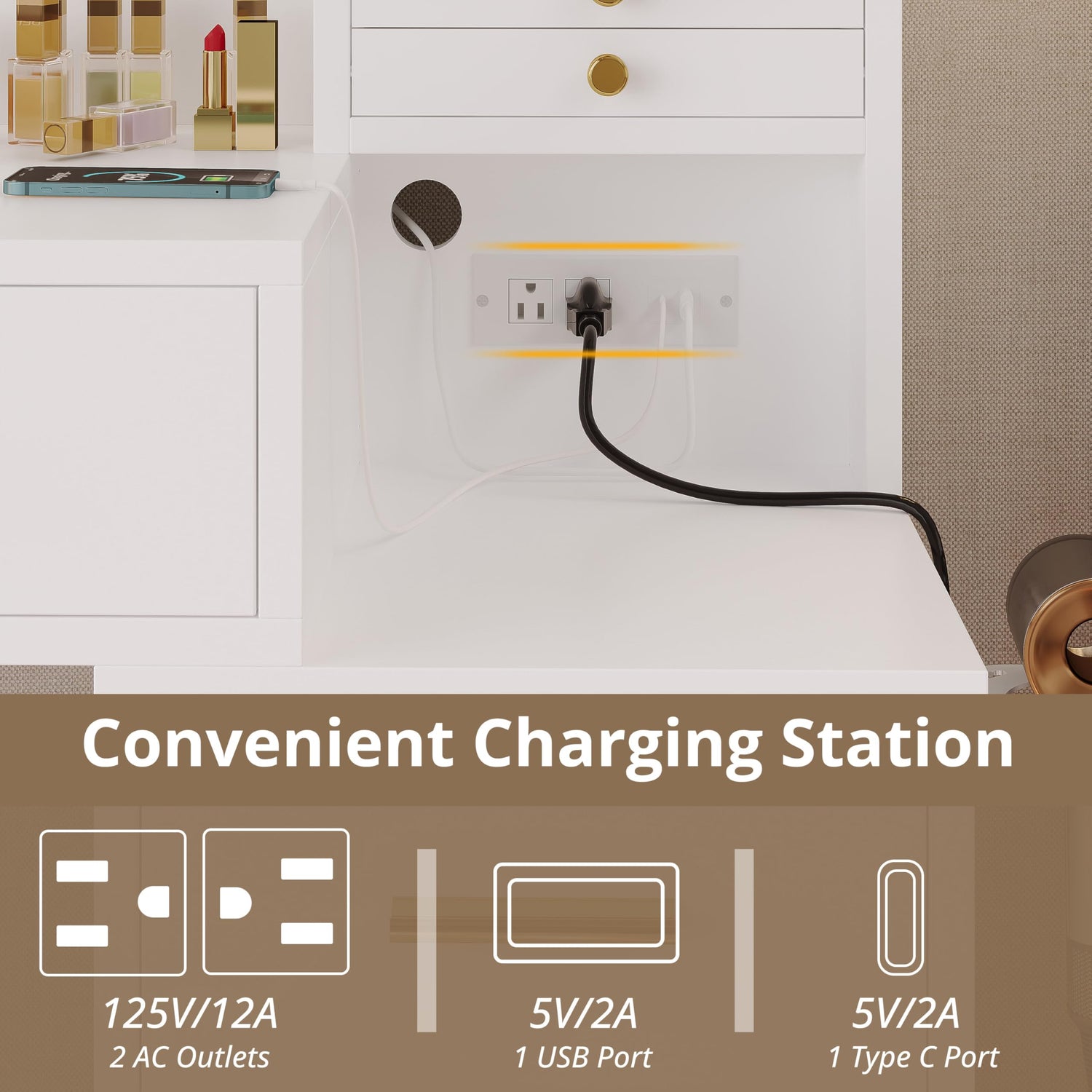 - Built-In Power Outlet: This vanity power outlet is equipped with 2 sockets, 1 USB port and 1 Type C. You can easily connect your hair dryer, beauty instruments and charge your phone, tablet or other electronic devices at the same time. It is built into the back panel and does not take up desktop space