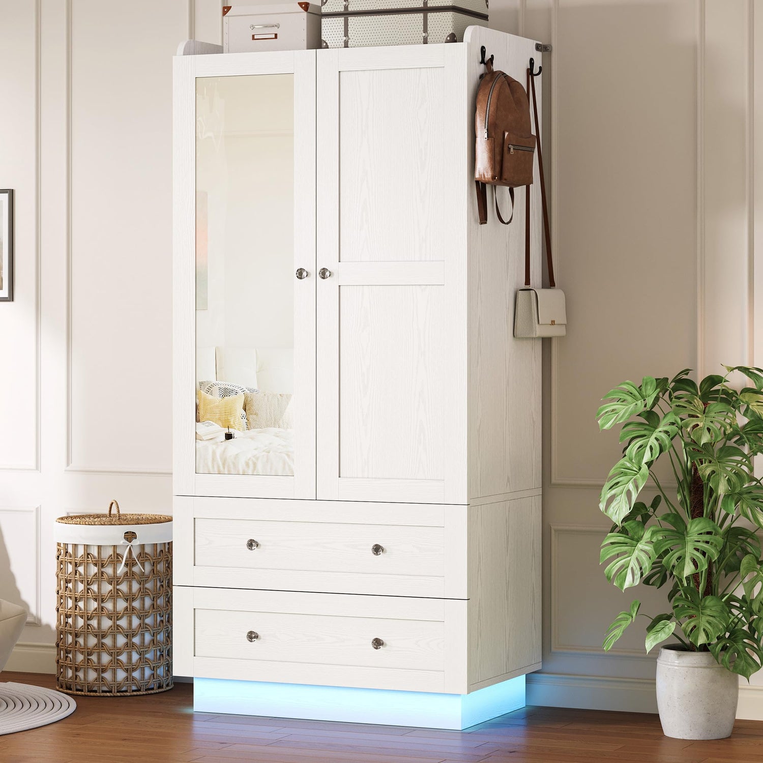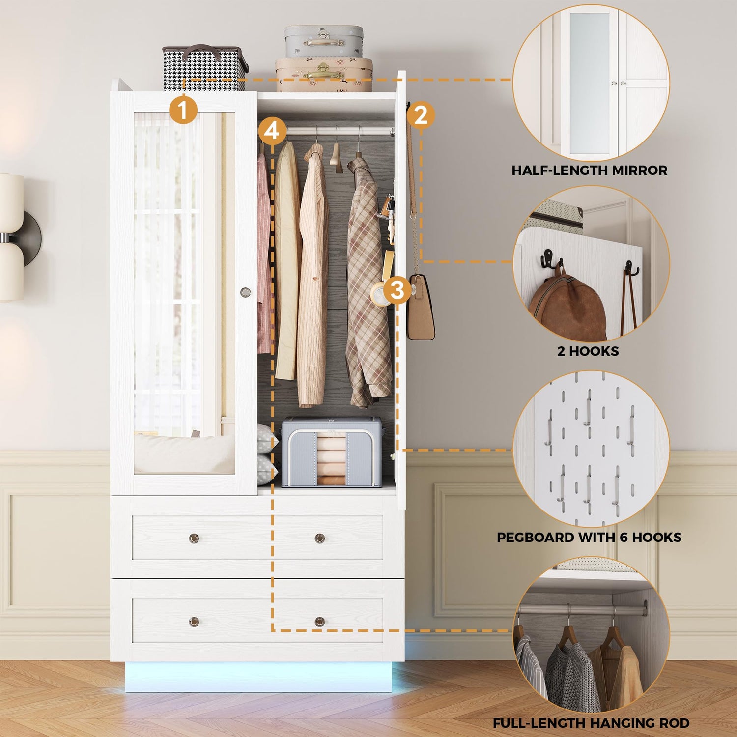 IRONCK Wardrobe Closet with LED Light & Mirror, Wooden Modern Armoire with 2 Drawers and Hanging Rod, Large Capacity Storage Closet for Bedroom, White
