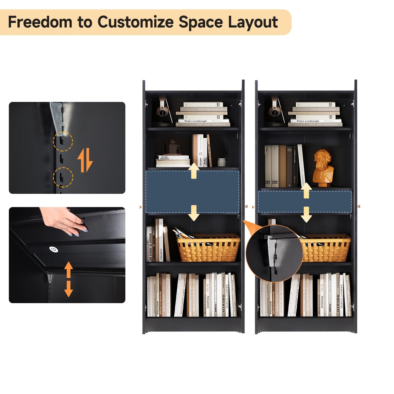 - Black Bookshelf with Doors in Sturdy Construction: IRONMIX black bookcase with doors and shelves is made of 0.7mm high-quality cold-rolled steel, which is stronger than typical steel, not easily deformed. Reinforcing ribs at the waist and bottom of the panel, further increasing the strength of bookshelf with storage. The adjustable feet of library bookcase deals with the uneven ground and protect your floor