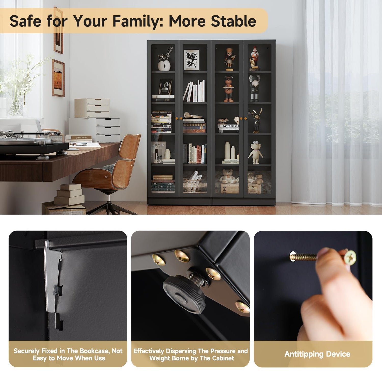 - Black Bookcase with Doors: The large bookcase uses visible doors, which are transparent and visible, and its light weight can reduce the risk of the 4 shelf bookcase tilting forward when the door is opened. To protect the door, a protective film has been applied to each side of the door. You can remove the protective film according to the instructions