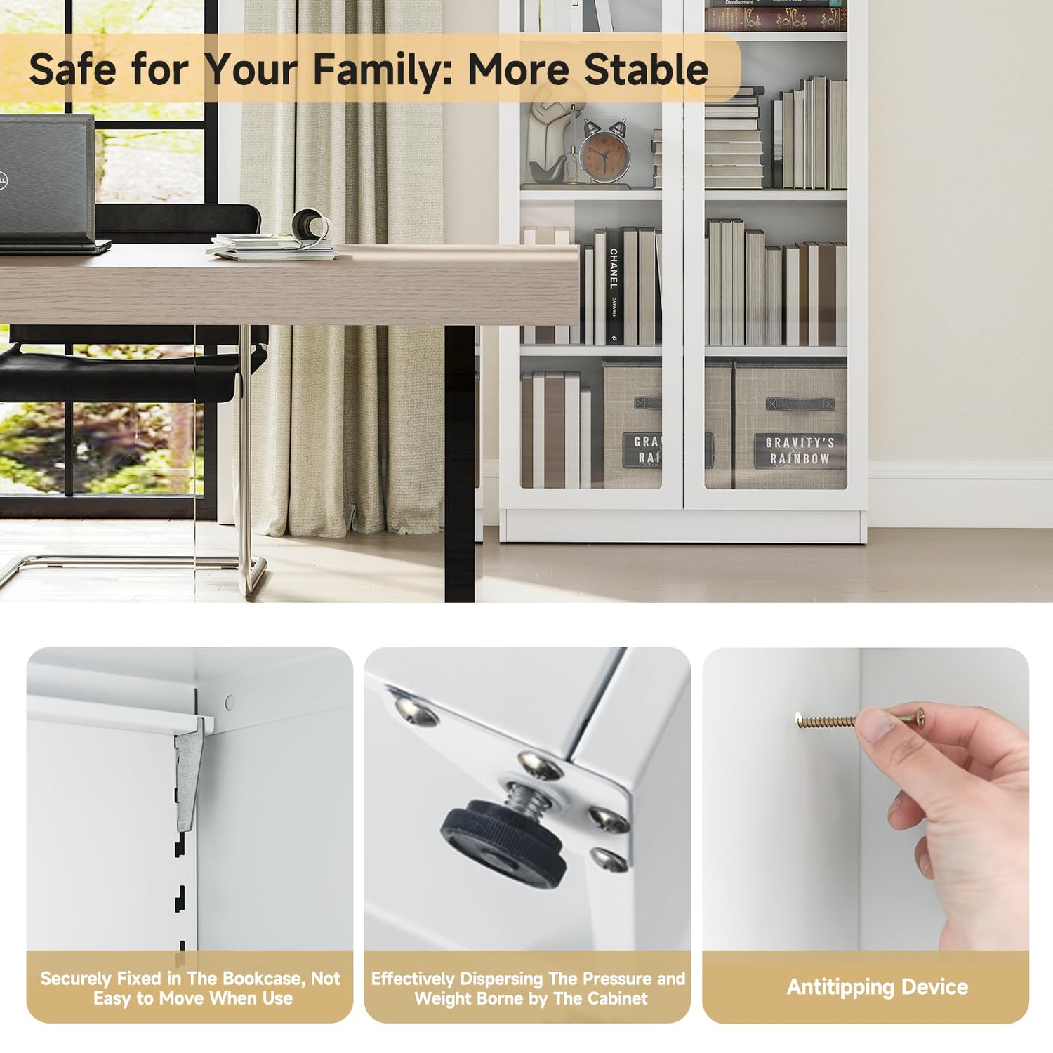 - 5 Tier Bookcase with Doors: The doors of tall bookcase are transparent, which is convenient for you to find things at a glance. The light weight of doors can reduce the risk of vertical bookshelf tilting forward when the door opened. To protect the door, a protective film has been applied to each side of the door. You can remove the protective film according to the instructions