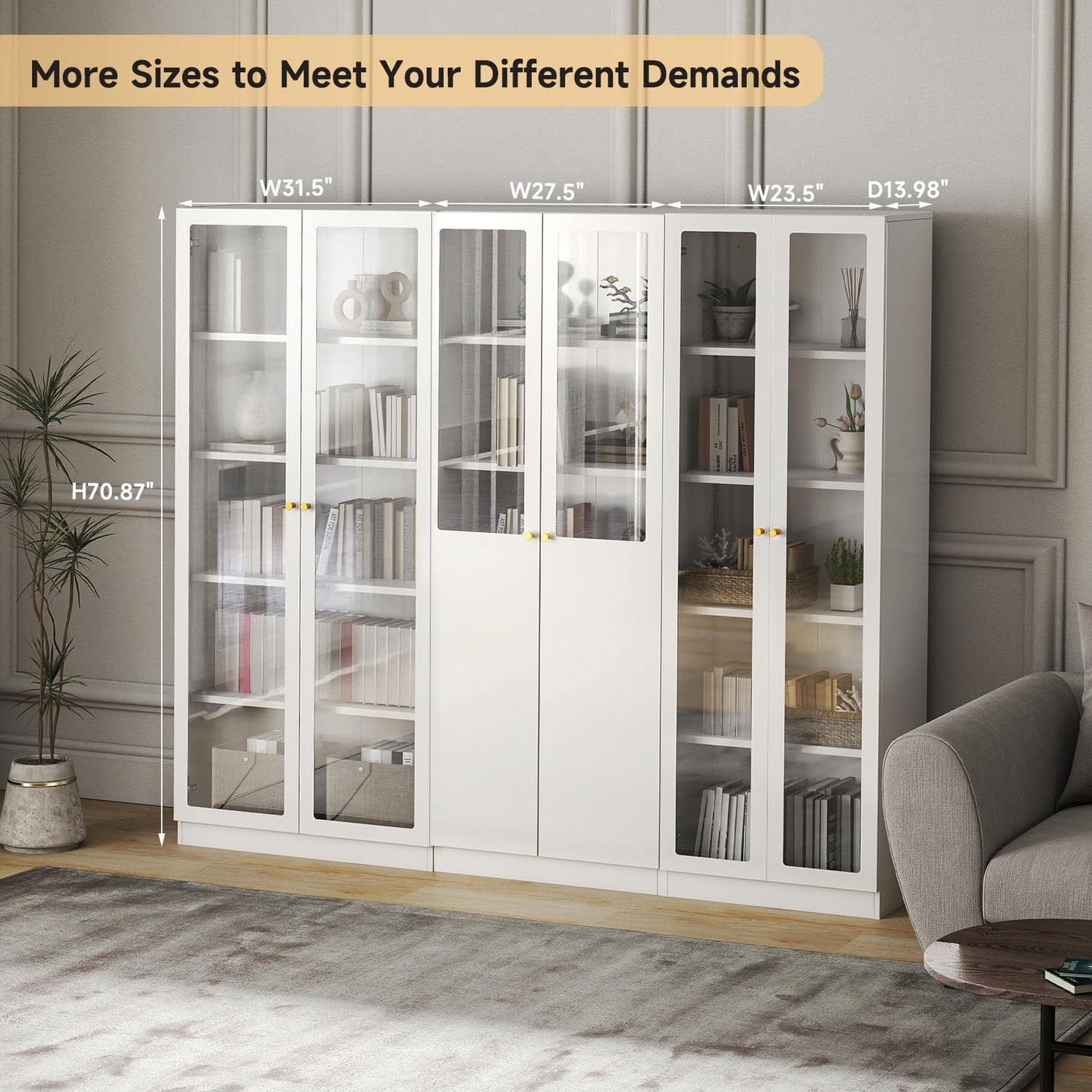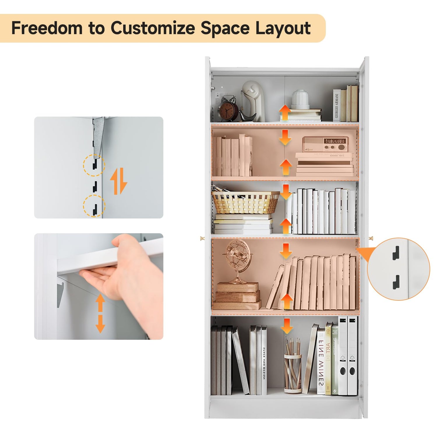 IRONMIX Modern Bookshelf with Doors and Shelves, 70.87" H Metal Bookshelf, Tall Bookcase, 5-Tier Curio Cabinet for Collectibles, White Storage Cabinet Display Case for Home Office, Living Room, School