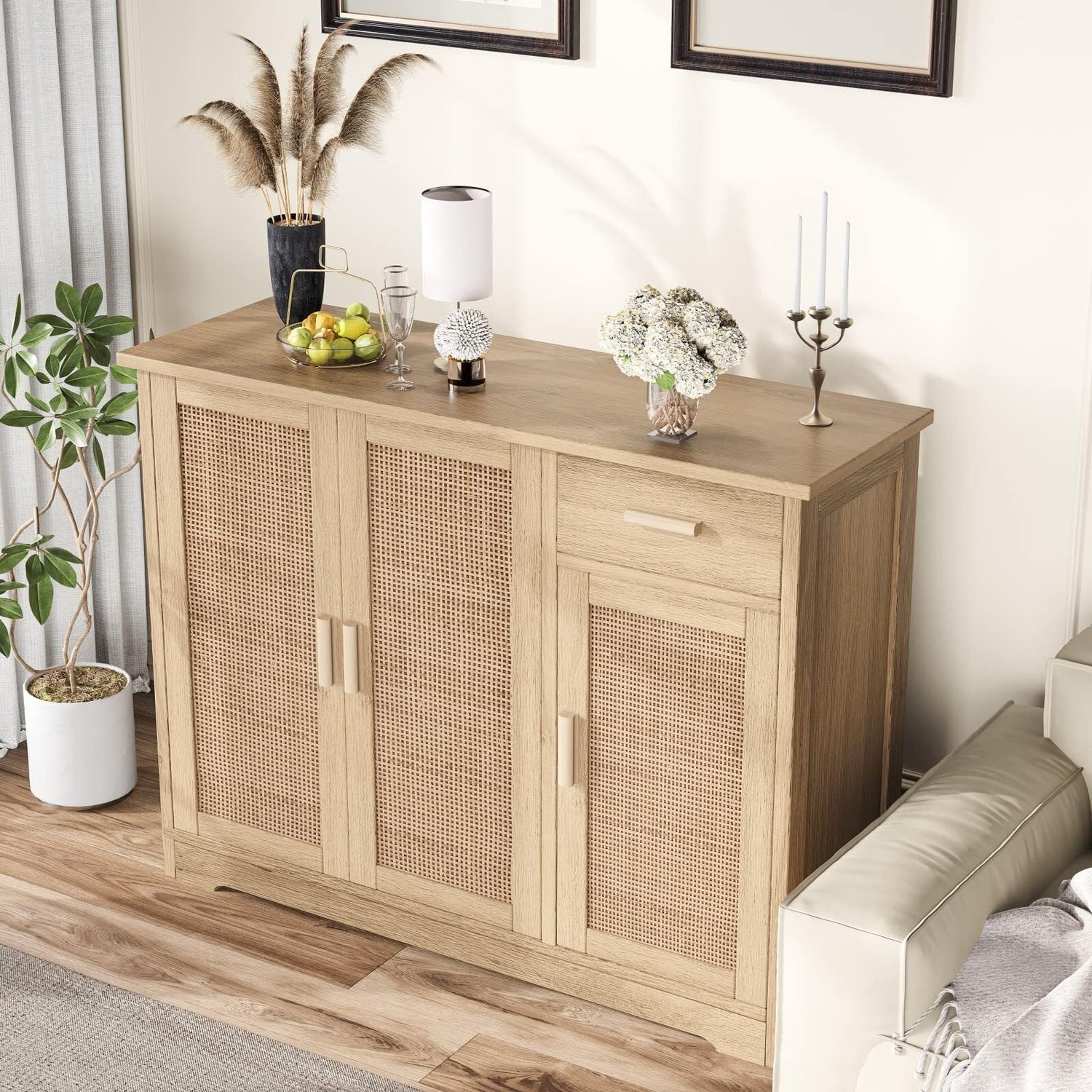 Irontar Kitchen Storage Cabinet, Sideboard Buffet Cabinet with Rattan Decorated Doors, Farmhouse Console Table with Drawer, Coffee Bar, Accent Table for Kitchen, Living Room, Hallway, Natural CWG010M