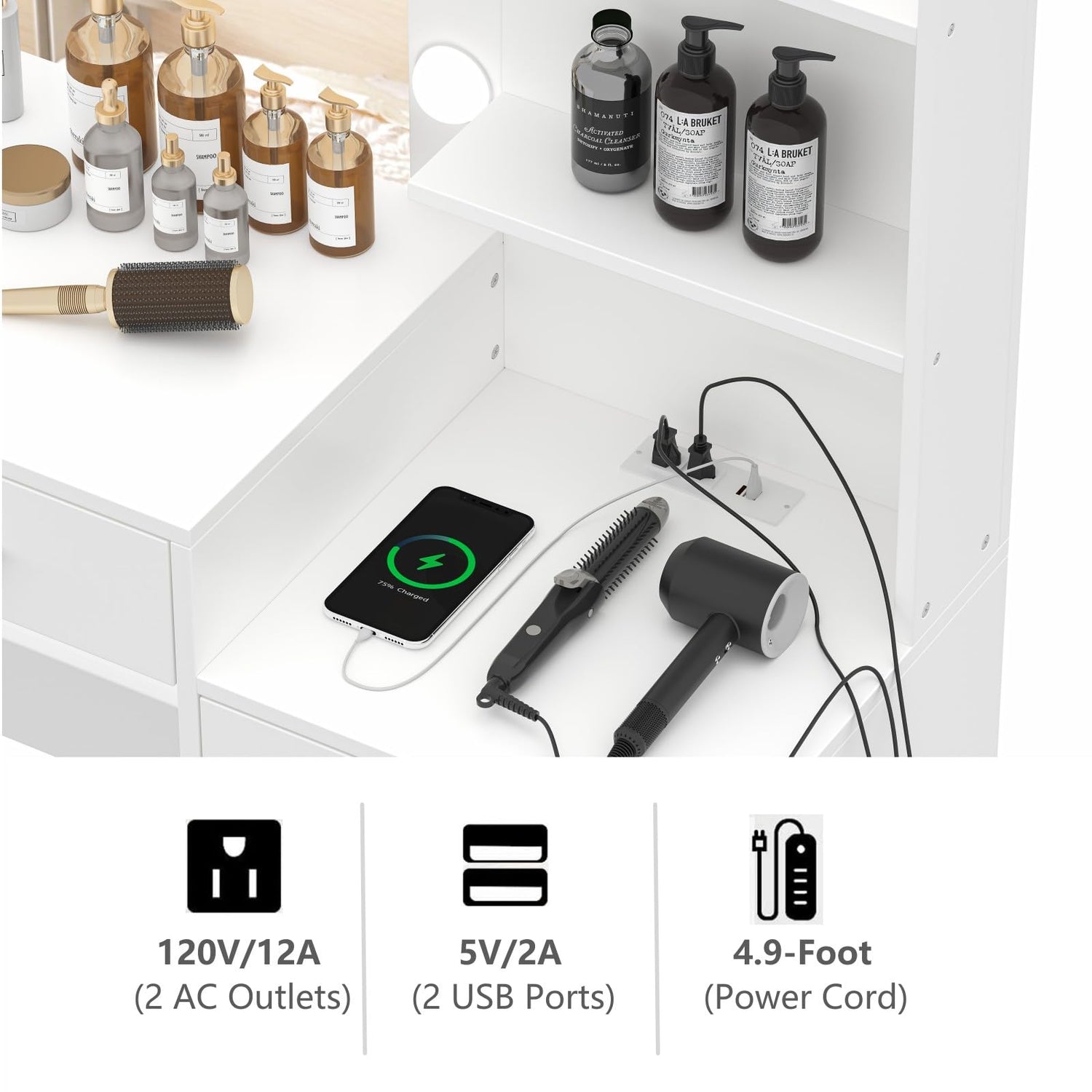 - Makeup Table with Charging Station: Are you still worried about charging?Now this large makeup desk is equipped with 2 AC power outlets and 2 USB ports to apply more charging choice for your phone, computer and other electronic devices at the same time. Besides, it is very convenient to use hair dryer or hair curling iron in front of the vanity mirror
