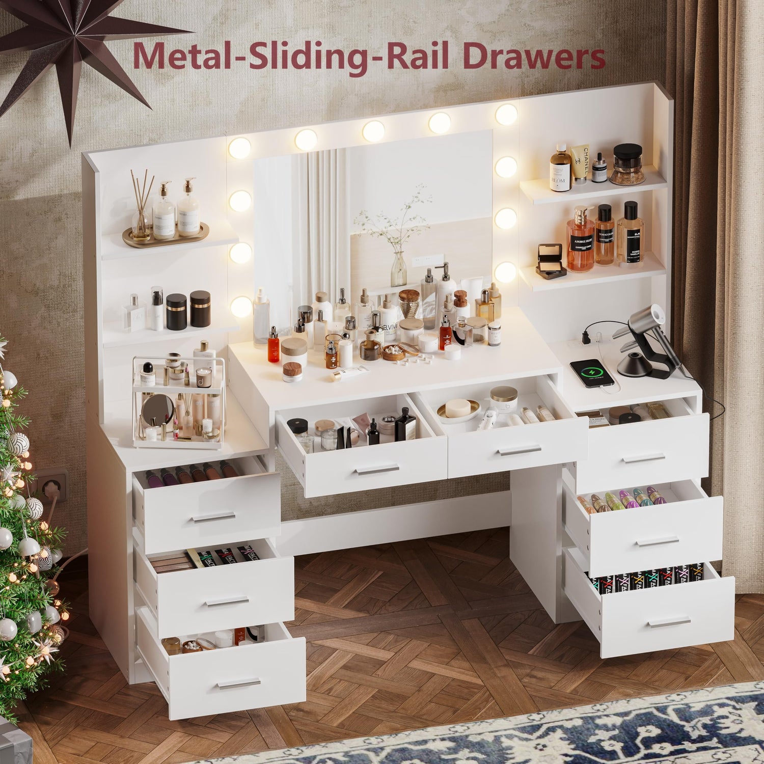 Irontar Makeup Vanity Table with Mirror & Lights, Vanity Desk with Power Strip, Large Drawer & Six Open Storage Dresser, 3 Lighting Modes Adjustable Brightness, Dressing Table, White WDT006W