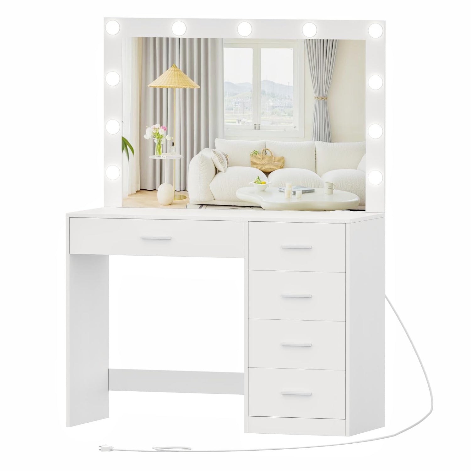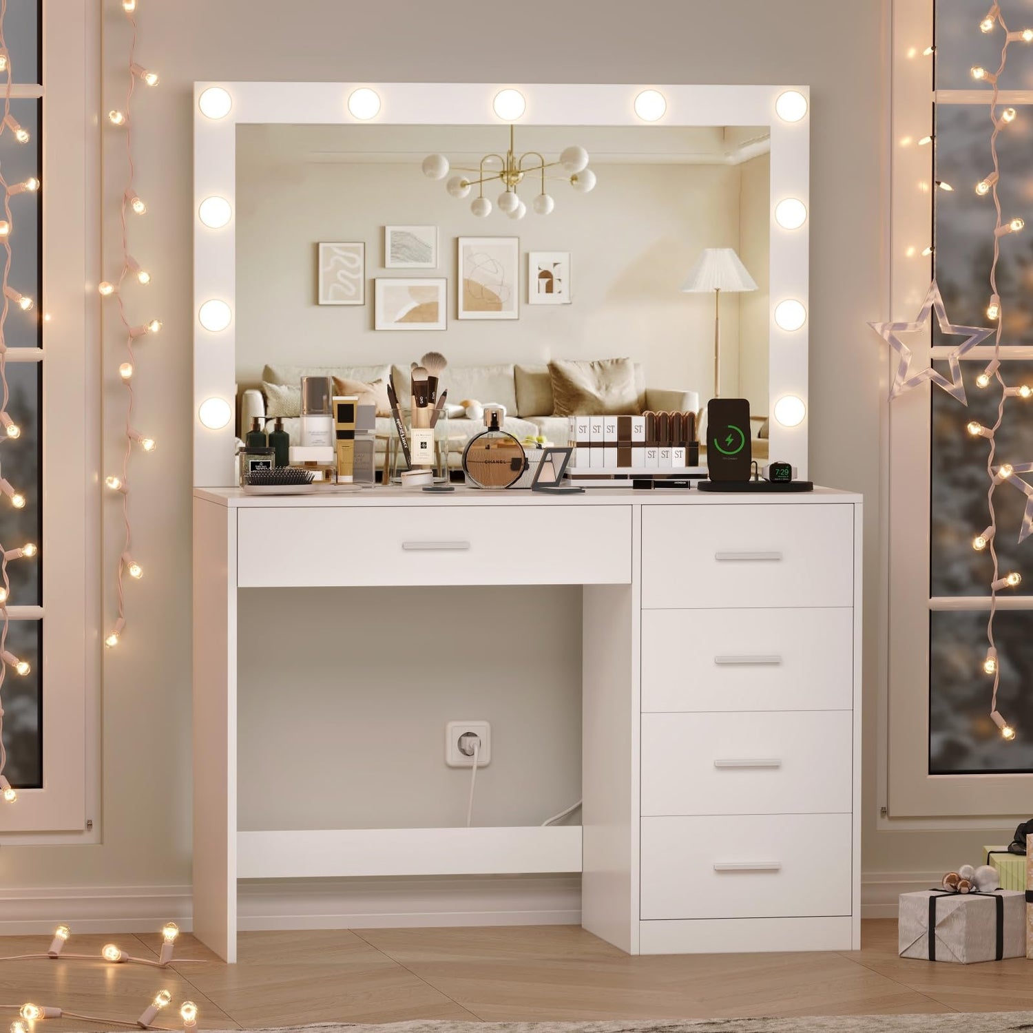 Irontar Vanity Desk with Charging Station, Makeup Table with Large Mirror, Makeup Vanity with Lights, Brightness Adjustable, Dressing Table Desk with 5 Drawers, Bedroom Vanity Table, White WDT010W